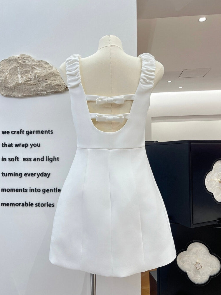 This bow-back mini dress blends sweet romantic details with a clean structured silhouette, creating a look that feels both soft and statement-making