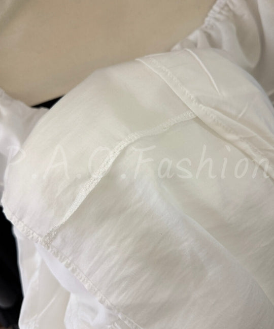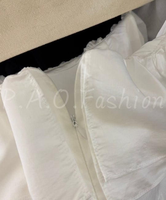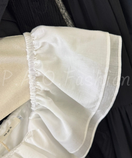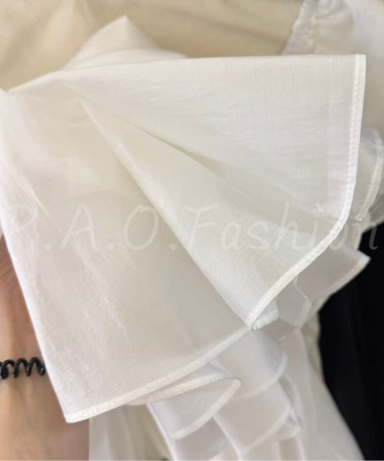 Soft double-layer ruffles frame the shoulders and collarbone, creating a romantic silhouette while elongating the neckline