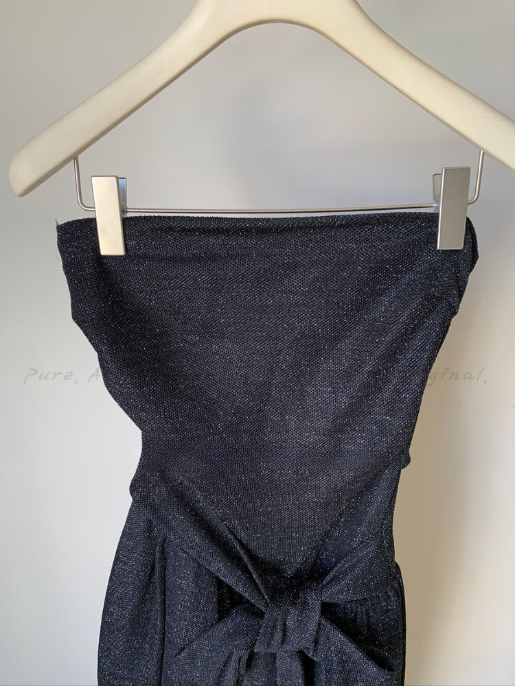 Sleek strapless silhouette with subtle sequin texture for light sparkle and refined shine.