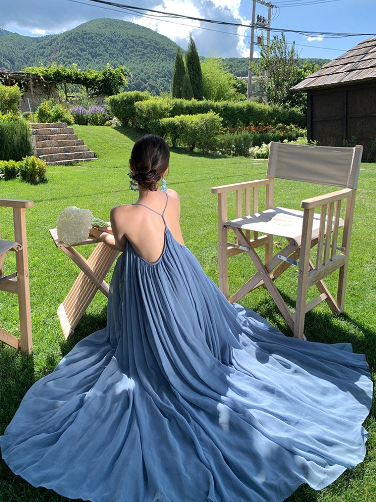 MARISOL SCARF DRESS is a breezy and elegant maxi dress that brings together effortless summer charm and French-inspired sophistication. Crafted from lightweight woven polyester chiffon with delicate pleated detailing, this dress features a flattering deep V-neckline and slender straps that emphasize the neckline and clavicle. The relaxed A-line silhouette flows into a wide, graceful skirt, creating a flowing movement that evokes seaside ease and resort romance. With its back-reveal design and refined silhouette, this dress channels both elevated femininity and casual holiday elegance — perfect for beach vacations, seaside dinners, garden soirées, or summer city outings.