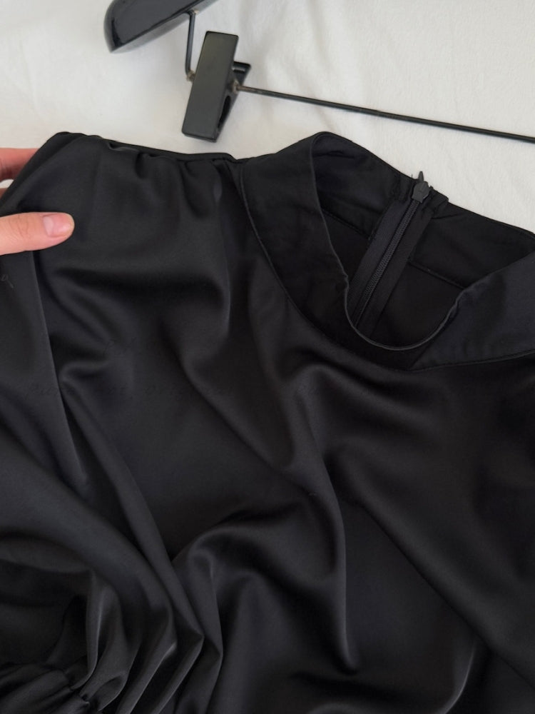 100% Polyester. Woven fabric with smooth finish and structured drape. Gentle wash recommended to preserve shape and quality.