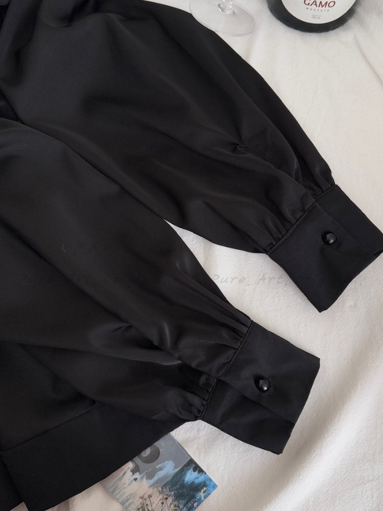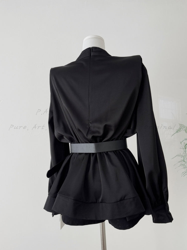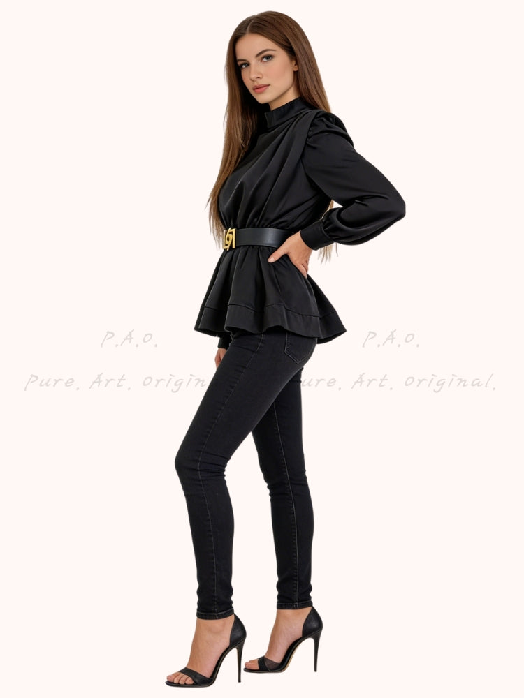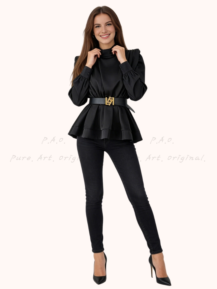 CORINNE SHIRT is a refined and elegant long-sleeve blouse crafted from smooth woven polyester, designed to elevate everyday and elevated looks with a classic yet modern silhouette. Featuring a belted waist that cinches the figure and creates a flattering profile, this minimalist shirt brings a polished and sophisticated feel perfect for chic, French-inspired styling. The timeless design nods to elegant wardrobe staples often seen in refined outfits, pairing seamlessly with tailored trousers or skirts for a Hepburn-esque vibe that balances timeless simplicity with contemporary sophistication.