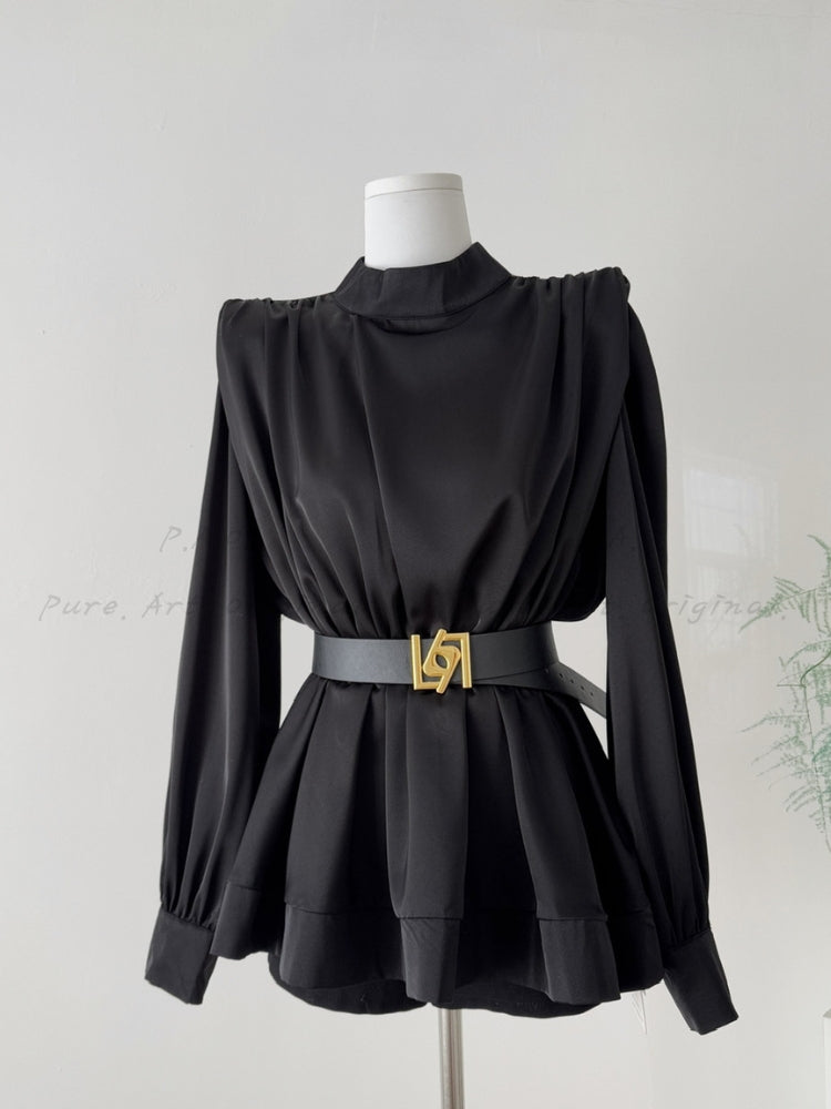 Long-sleeve belted blouse with a clean, classic silhouette that flatters the waist and defines the figure.