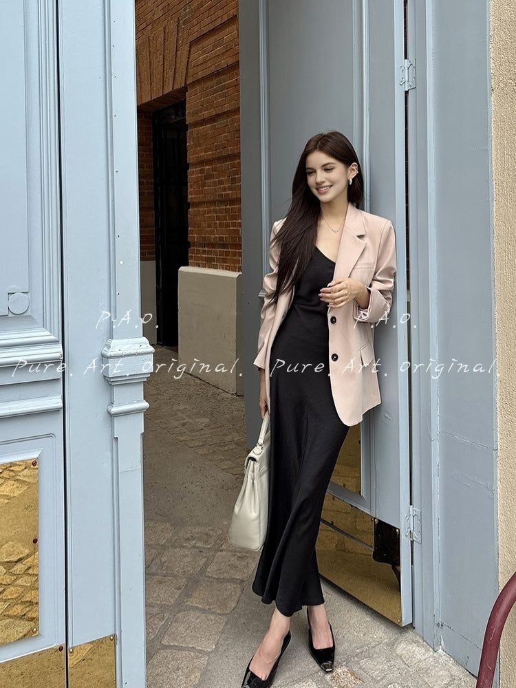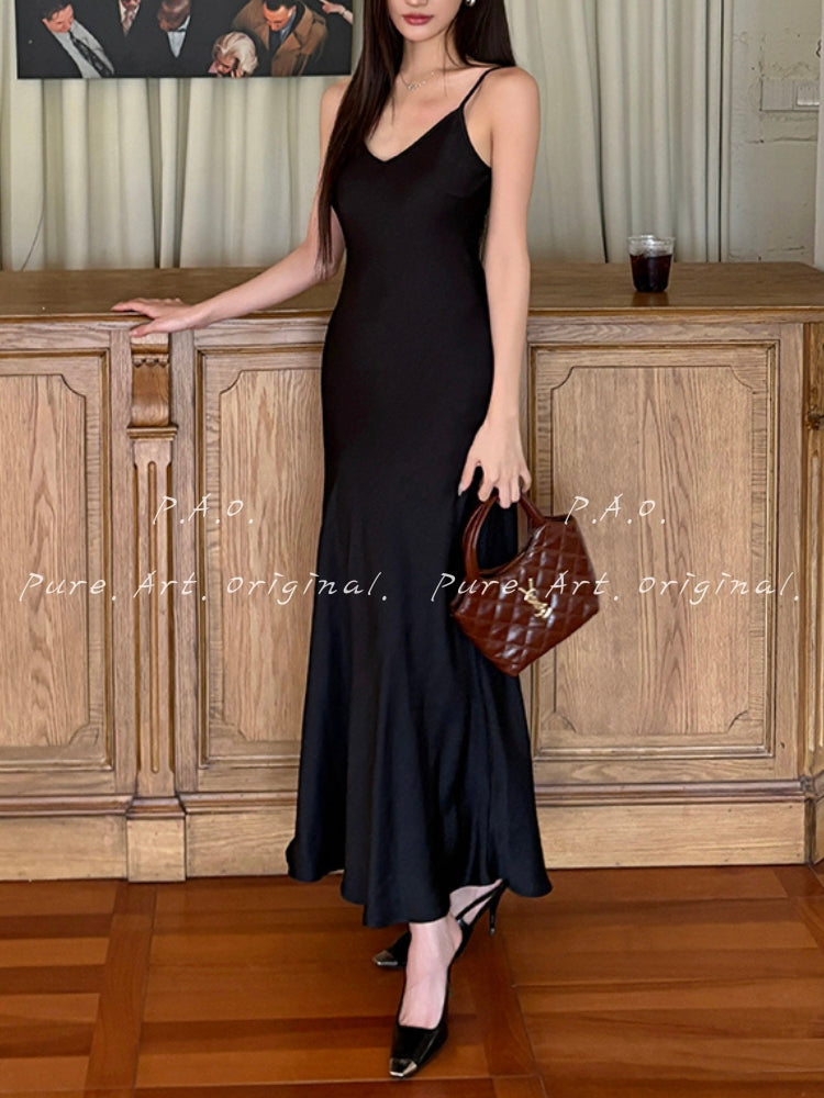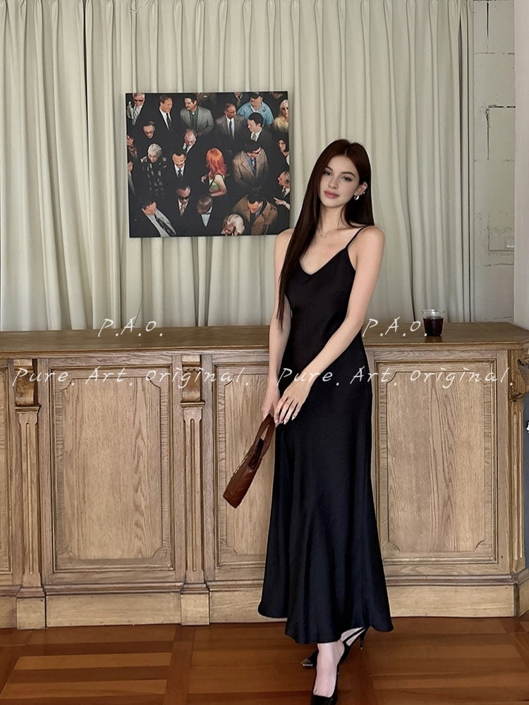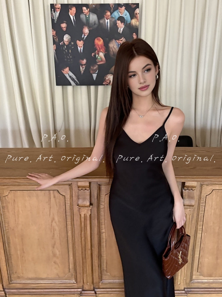 The Noelle Dress embodies modern elegance with a sleek silhouette and luminous satin finish. Designed with delicate spaghetti straps and a plunging V-neckline, the dress beautifully highlights the shoulders and collarbone while creating a refined, feminine shape.