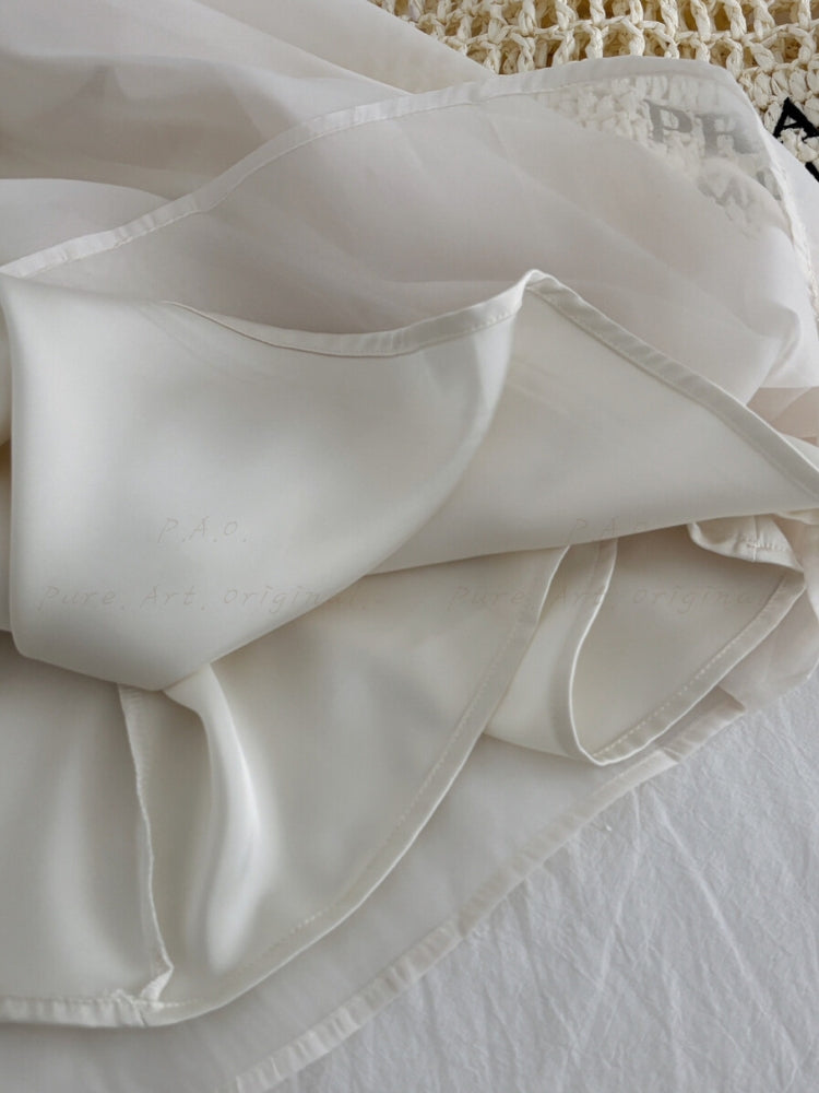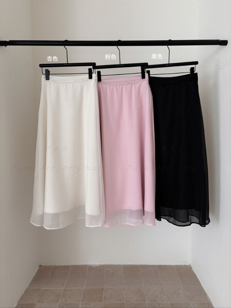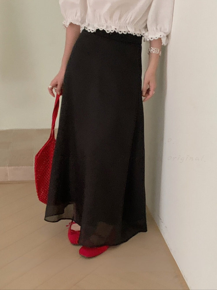 An elegant long skirt featuring a flattering mermaid-inspired A-line silhouette. Designed with a comfortable elastic waistband and soft chiffon ruffle hem, this skirt moves beautifully with every step while enhancing the waistline for a slimming effect. Perfect for both everyday styling and elevated occasions.