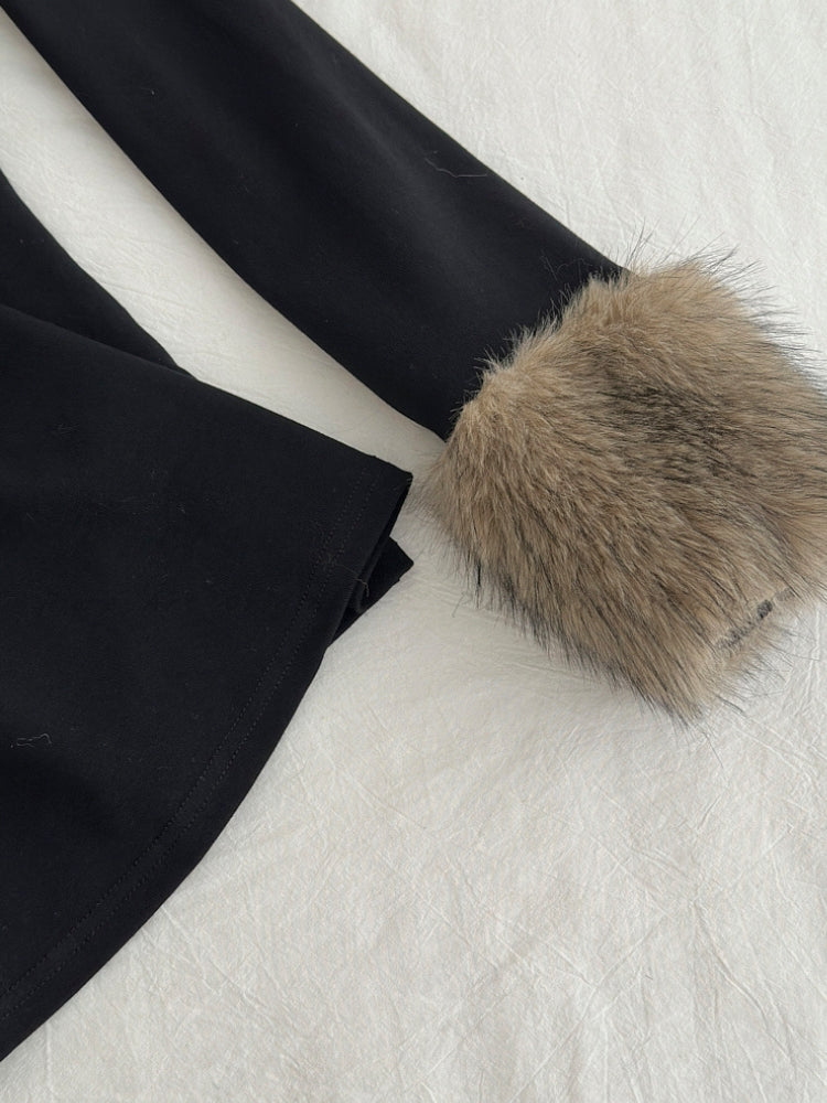 100% Polyester. Knit fabrication with faux fur trim for texture contrast. Gentle wash or dry clean recommended to preserve the fur trim and knit shape.