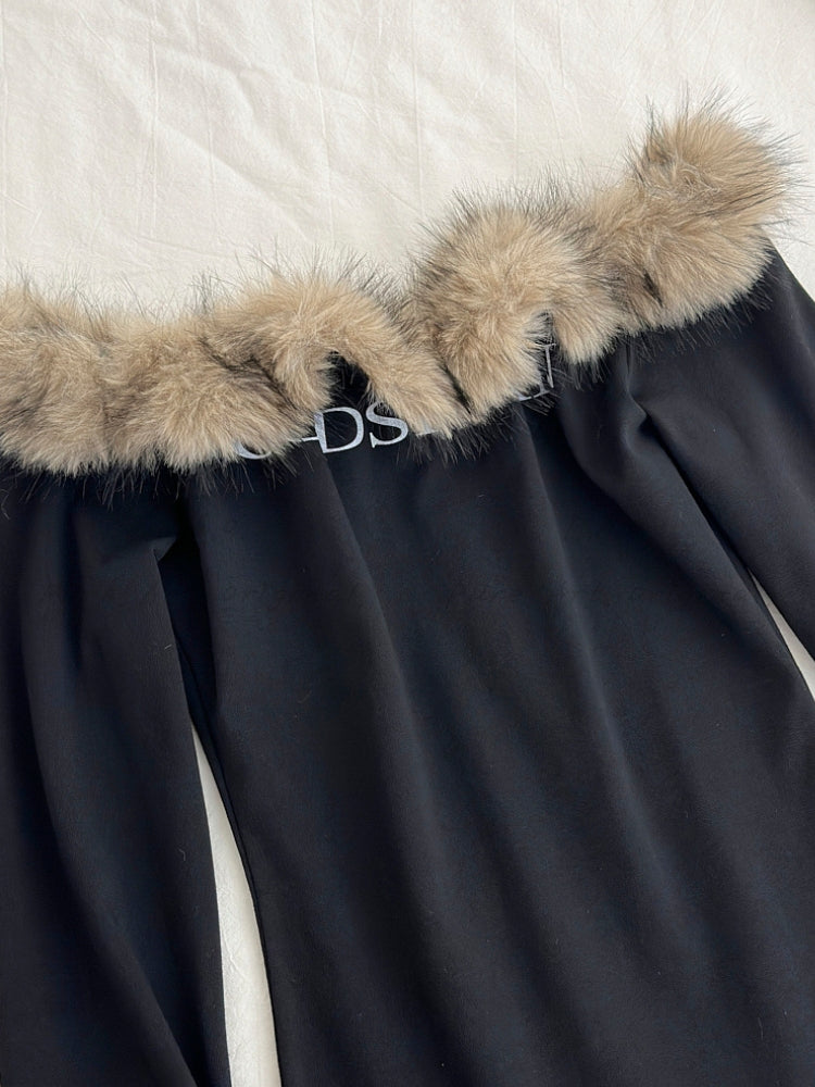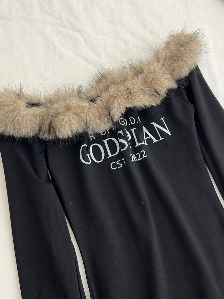 Off-shoulder neckline with plush faux fur trim for elevated texture and visual impact. Fitted knit construction that contours the body for a sleek silhouette. Long sleeves balance the exposed neckline and add warmth. Sleek, solid-color design with modern styling. Ideal statement piece for seasonal outfits or standout layering.