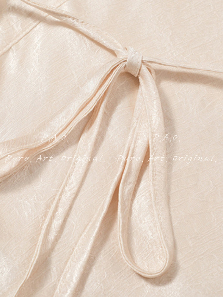 The floor-length hem sways gracefully with every step, while the glossy satin finish adds a soft, luxurious sheen. In a warm apricot tone, the Seren Dress feels refined, feminine, and effortlessly elevated.