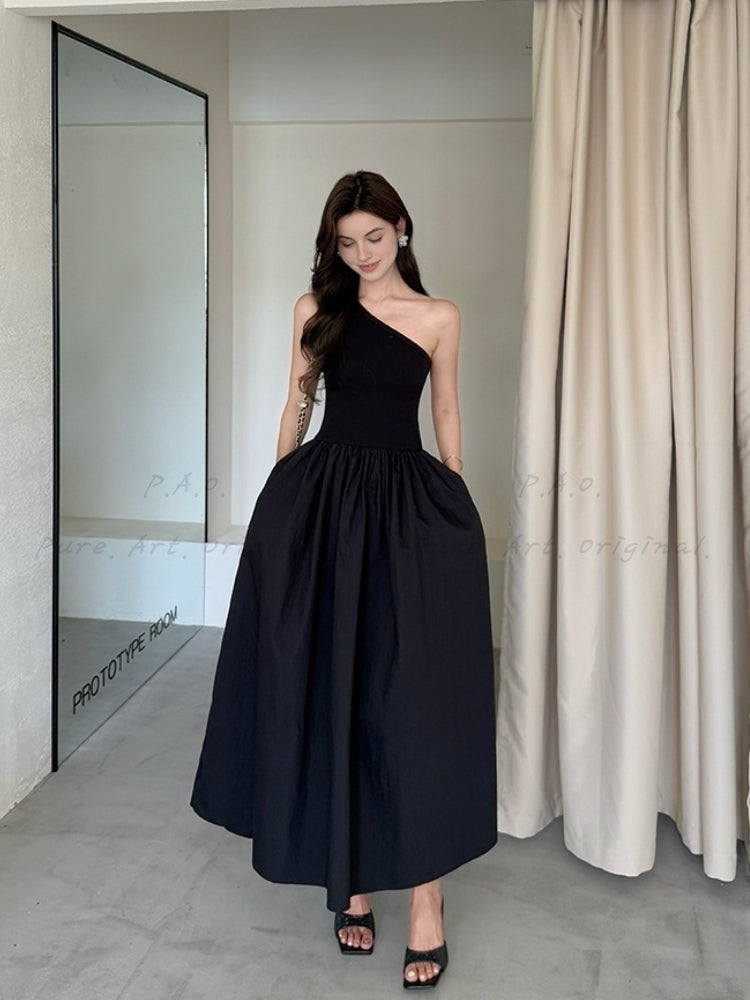 Asymmetric one-shoulder neckline creates a modern, chic silhouette. High-waist design enhances body proportions and defines the waist. Pleated and spliced panel construction adds dynamic texture and visual depth. Flared maxi skirt offers graceful movement and presence. Structured woven polyester ensures smooth drape and shape retention.