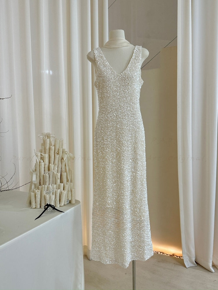 Inspired by refined French elegance and radiant soirée glamour, MERMAID GLOW – LUMINA DRAPE is a stunning full‑length gown that combines luminous texture with fluid movement. Crafted in pearl‑like sequin fabric on a velvet base, this dress radiates a warm, glowing sheen while maintaining a soft, tactile richness. The sleek V‑neck sleeveless silhouette is tailored to flatter the figure with graceful lines, while the long, draped sashes at the back add a touch of movement and dimensional sophistication. Elegant and striking, this gown is perfectly suited for weddings, formal dinners, and other special occasions that call for a gentle yet captivating presence.