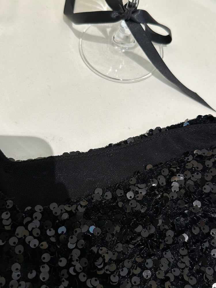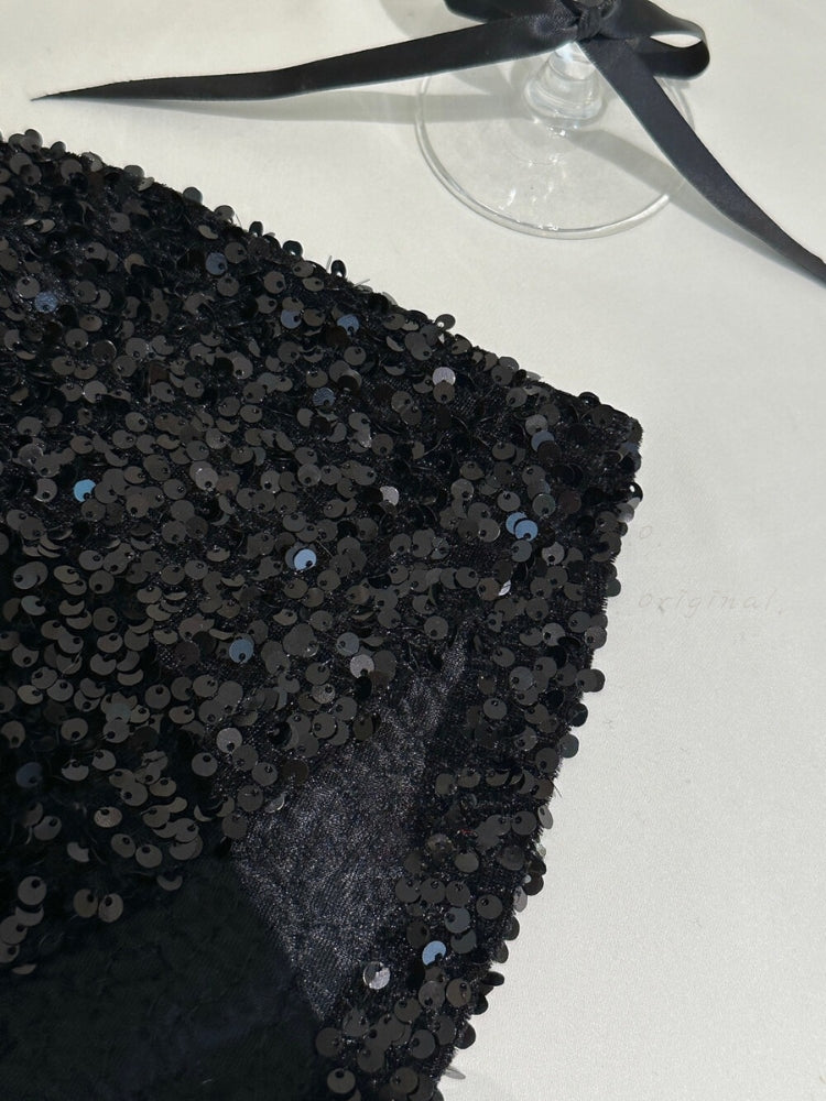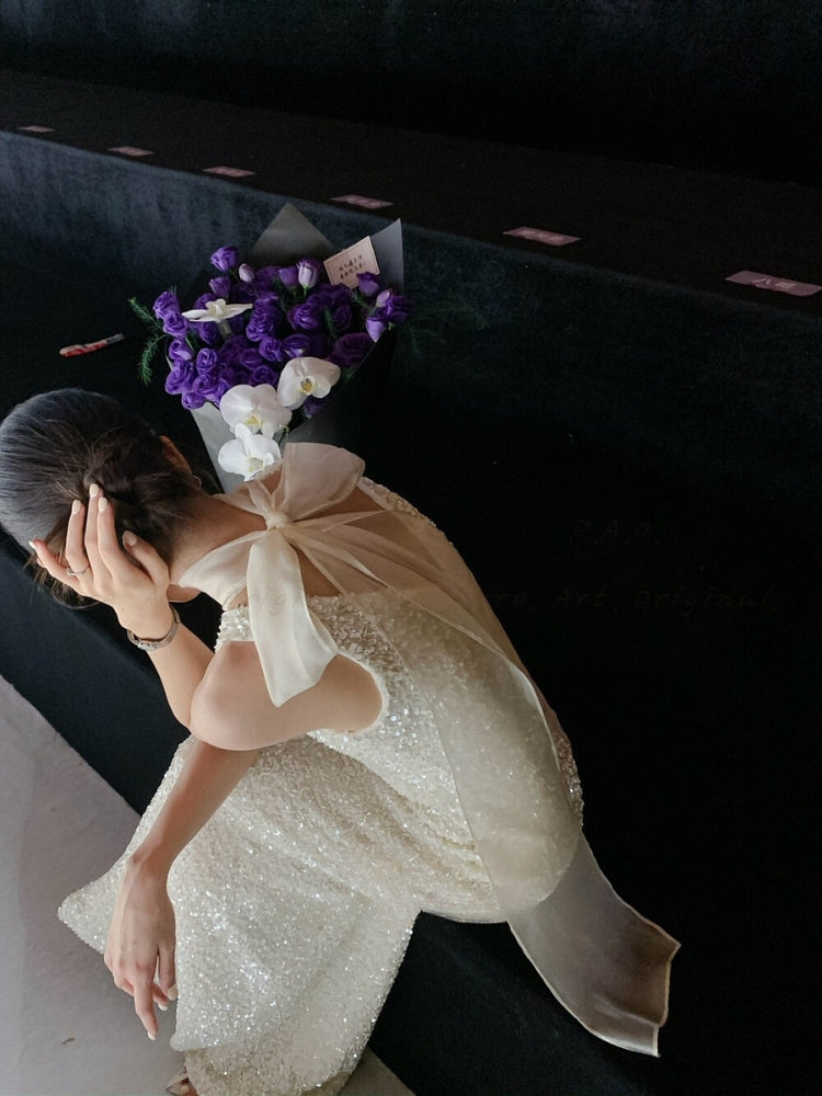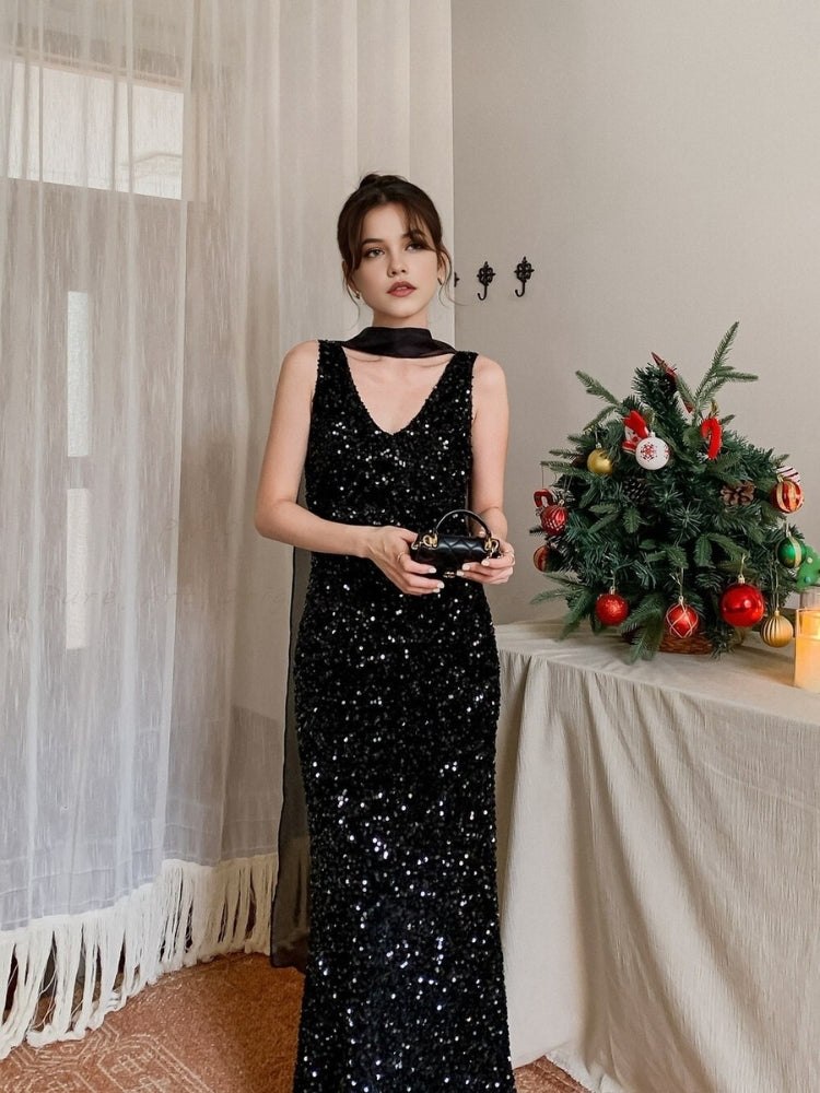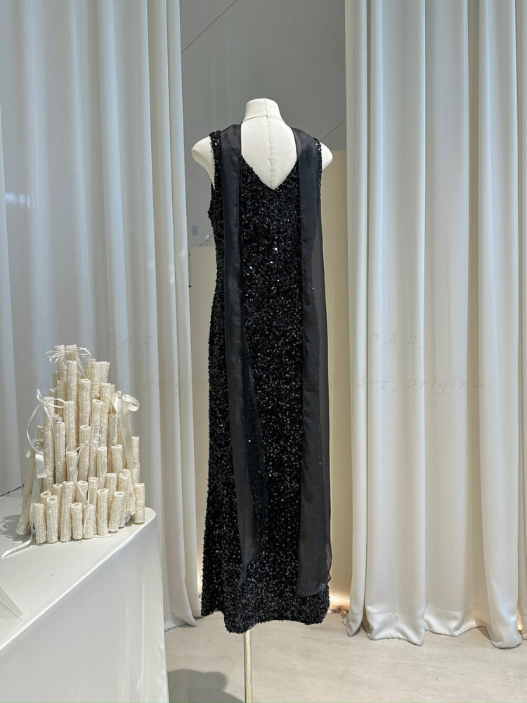 Crafted from pearl‑effect sequin adorned velvet that shimmers with soft, iridescent glow, this gown features a sophisticated V‑neck sleeveless design that flatters the upper body and neckline. The fitted cut gently defines the silhouette, while the long draped sashes at the back create an alluring sense of flow and dimensional movement without overpowering the clean lines of the dress. The overall effect is delicately glamorous with an elevated sense of refinement.