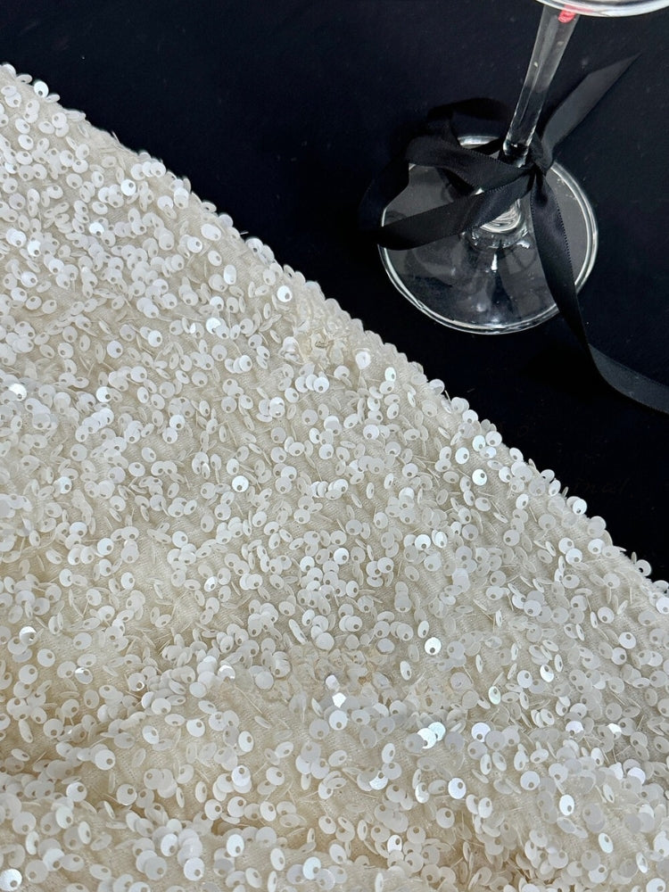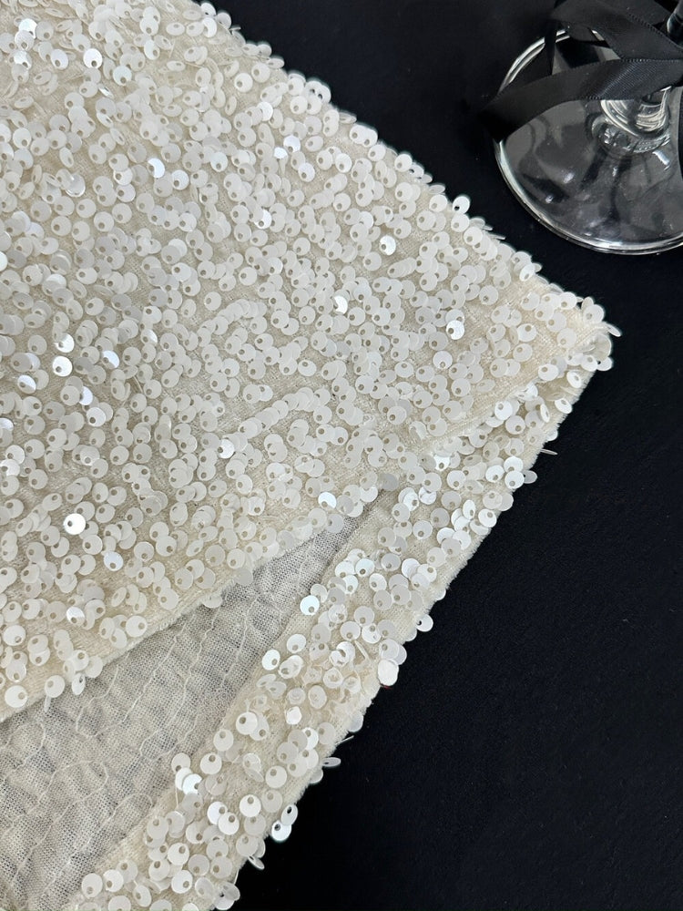 Made from 95% polyester and 5% spandex with a velvet base and full sequin surface for radiant luster. The fabric offers a rich texture with gentle stretch for comfort and ease of movement. A regular lining ensures comfortable wear. Gentle care is recommended to preserve the shine and integrity of the sequin and velvet finish.