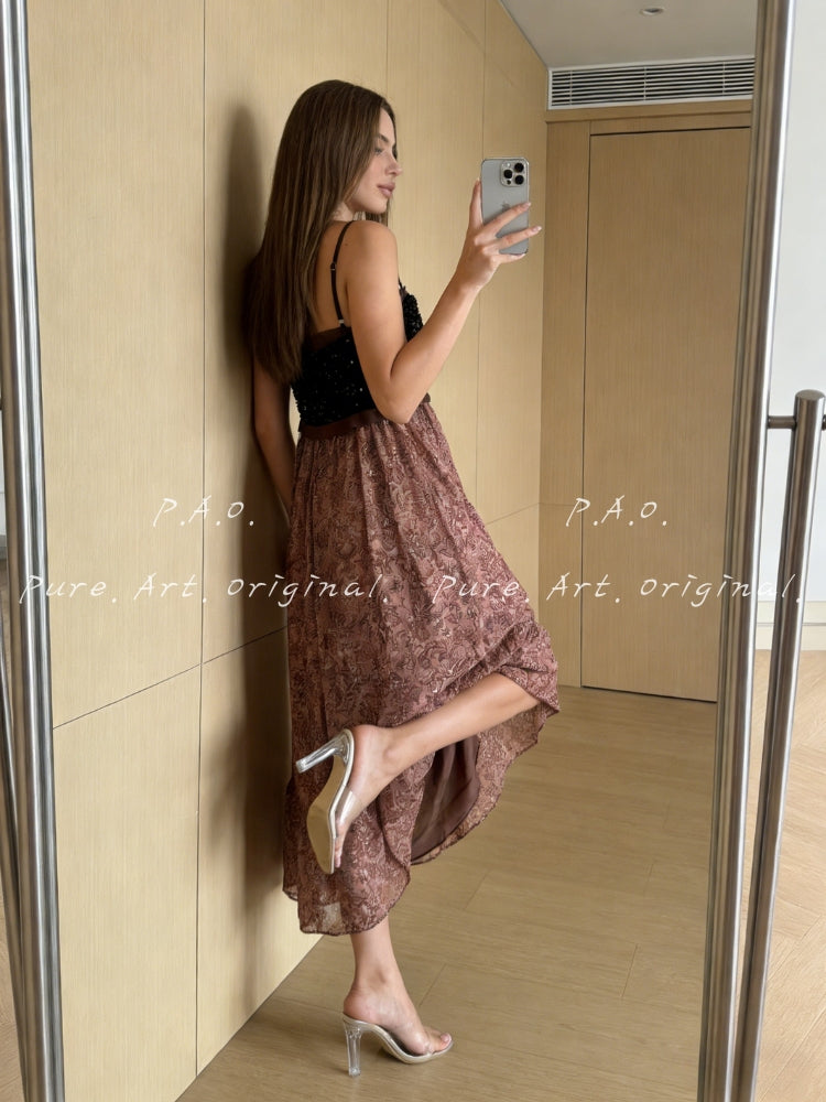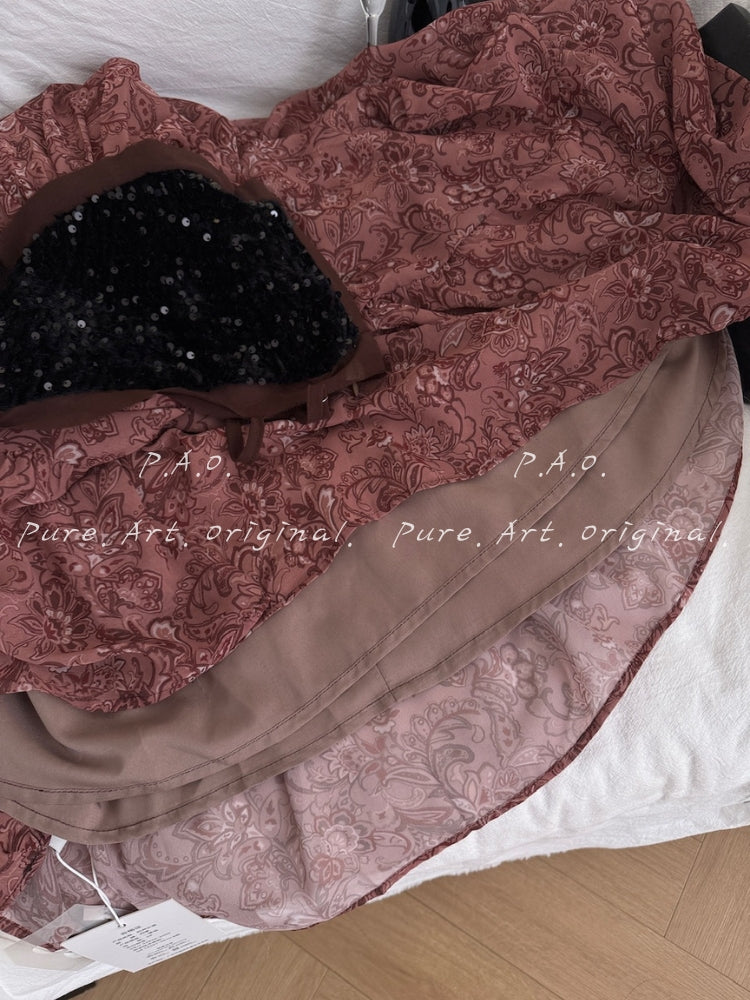 Black Sequin with Dusty Pink Floral Motif — a rich, expressive palette that evokes vintage markets and carefree charm.