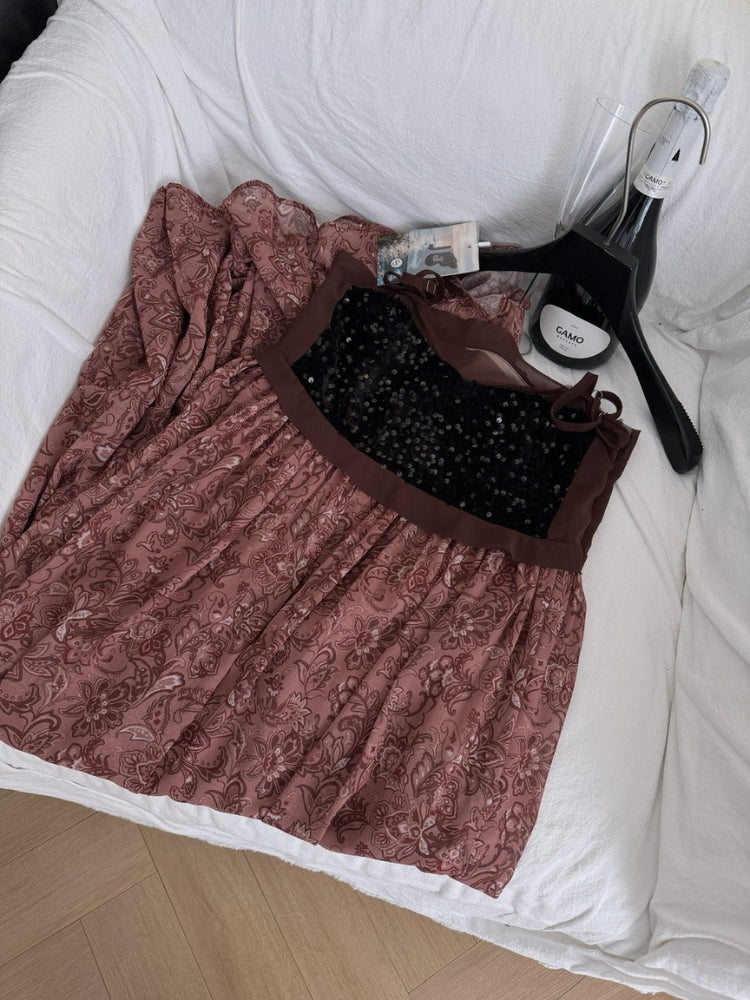 The Crescent Midi Dress blends bohemian romance with effortless elegance in a silhouette that moves with graceful ease. Featuring a fitted bodice with delicate straps and a softly flared midi‑length skirt, this dress delivers an expressive yet refined look. Rich velvet accents meet shimmering sequins and muted floral‑tonal patterns in a layered patchwork that feels both vintage‑inspired and modern.