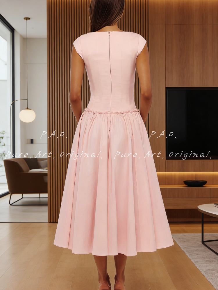 The bodice features a square neckline with soft cap sleeves, framing the collarbone while subtly refining the shoulder line. A corset-inspired structure with internal boning and shaped cups defines the waist and supports the bust, creating a sculpted yet wearable silhouette. Corset bodices are widely used in modern dress design to enhance proportions while maintaining comfort and flexibility