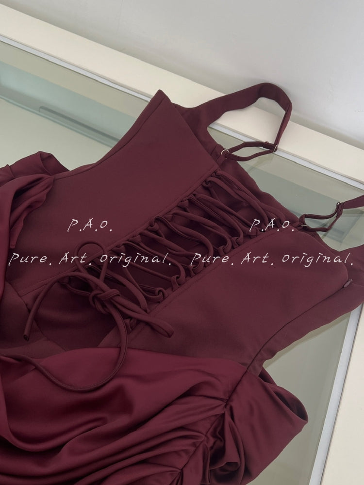 With its broad straps and defined neckline, this dress exudes timeless allure. The satin sheen adds a subtle glow that plays beautifully in evening light, while the fitted bodice and ruched skirt combine soft sophistication and bold edge in equal measure. Available in both classic black and rich wine tones, this dress transitions effortlessly from date night to special occasions, making it a versatile staple in any style-savvy wardrobe.