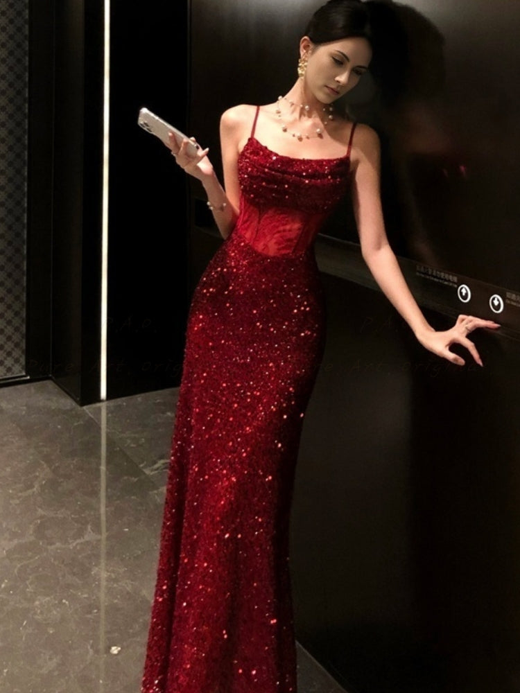 Dramatic, elegant, and designed to captivate — this sequin lace mermaid evening gown combines figure-flattering structure with sparkling sophistication. Crafted from smooth woven polyester, it features a fitted bodice that flows into a flared mermaid hem, enhancing curves and creating a graceful silhouette. The sleeveless design with subtle flared detailing adds modern charm, while the intricate sequin lace overlay brings luxurious shimmer. Perfect for weddings, formal events, coming-of-age celebrations, dates, and parties.