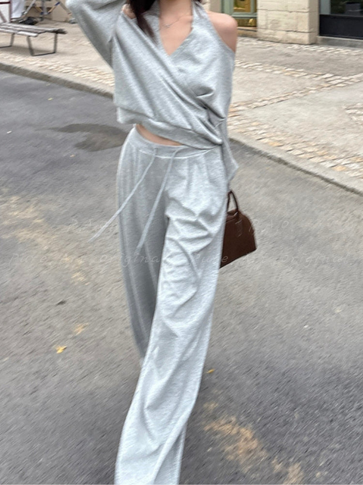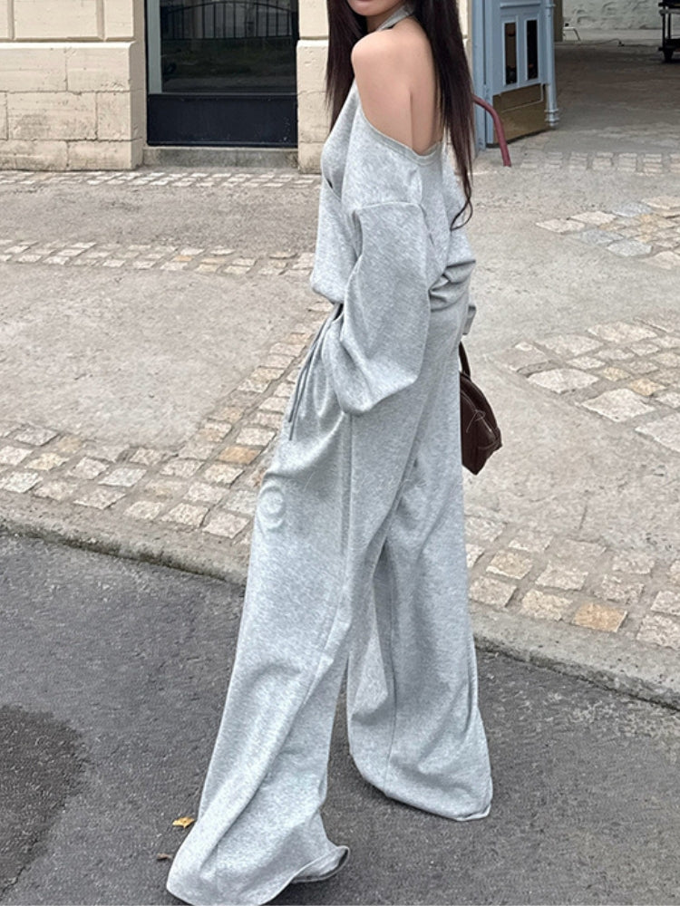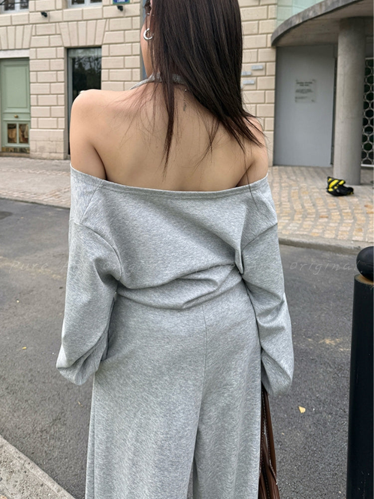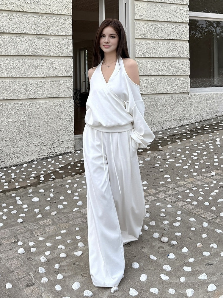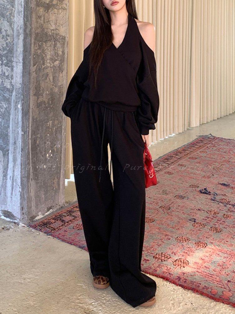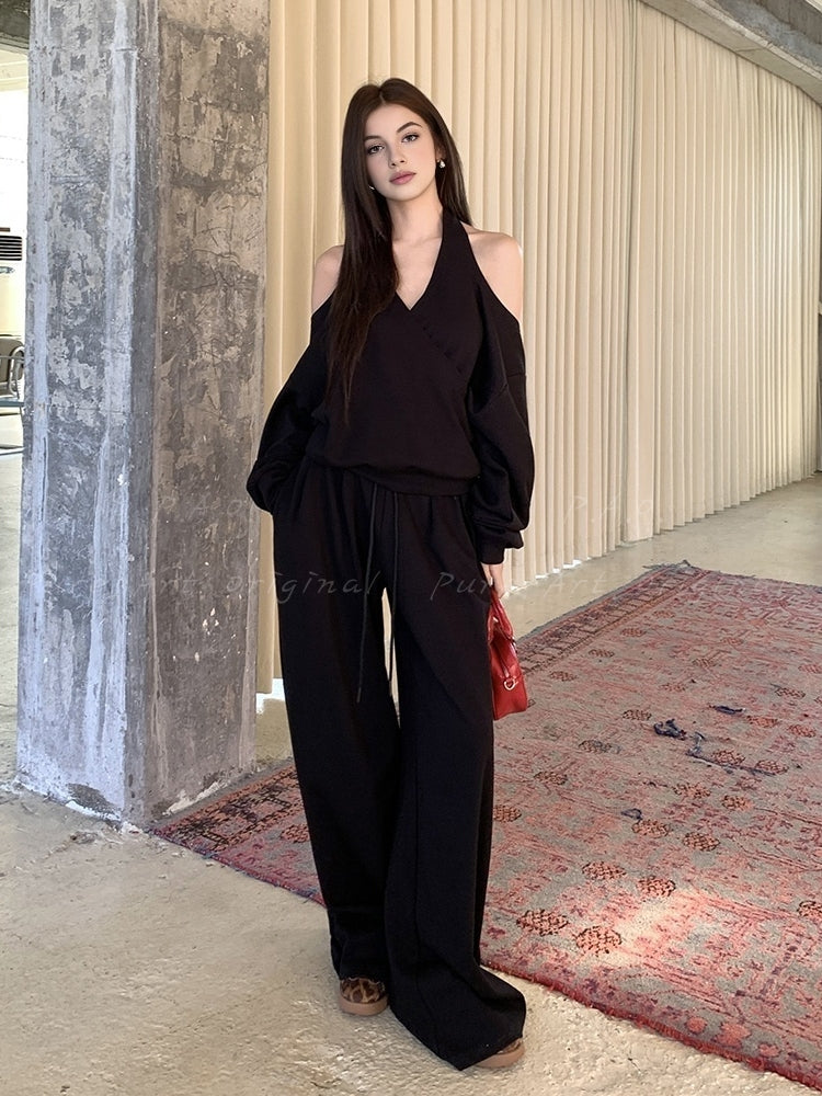 Off‑Shoulder Halter Sweatshirt & Wide‑Leg Pants Two‑Piece Set