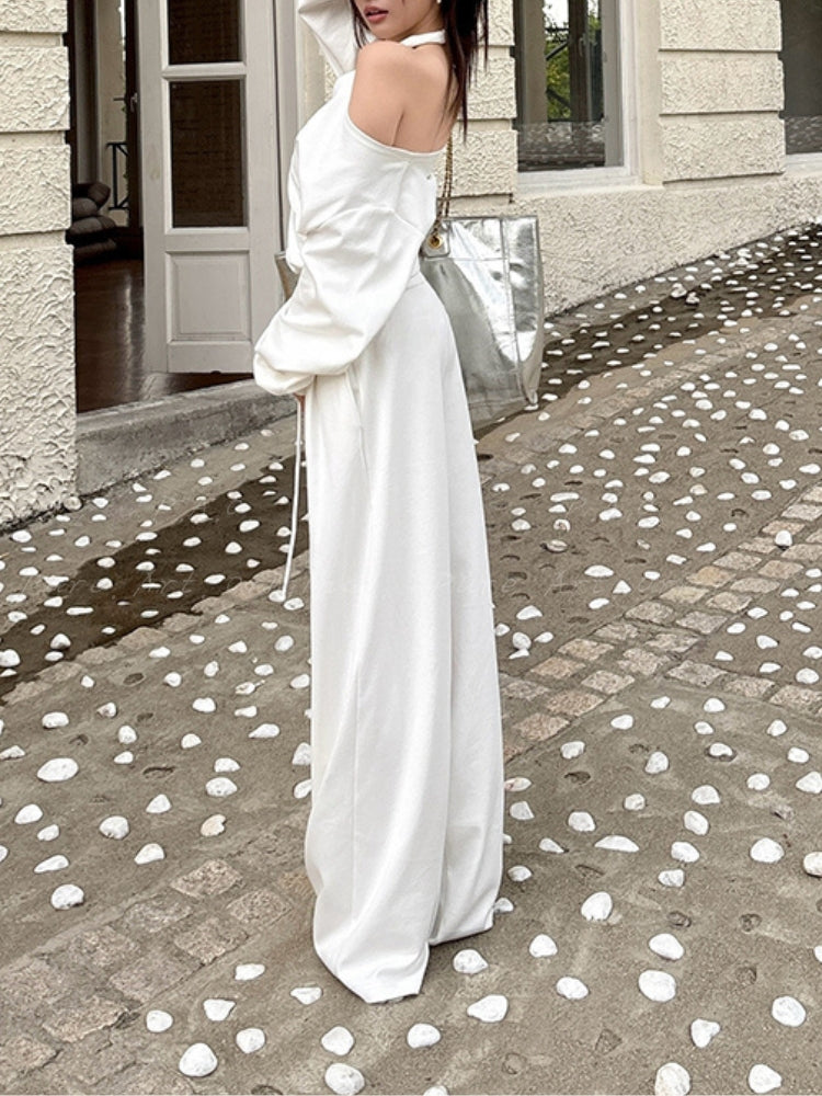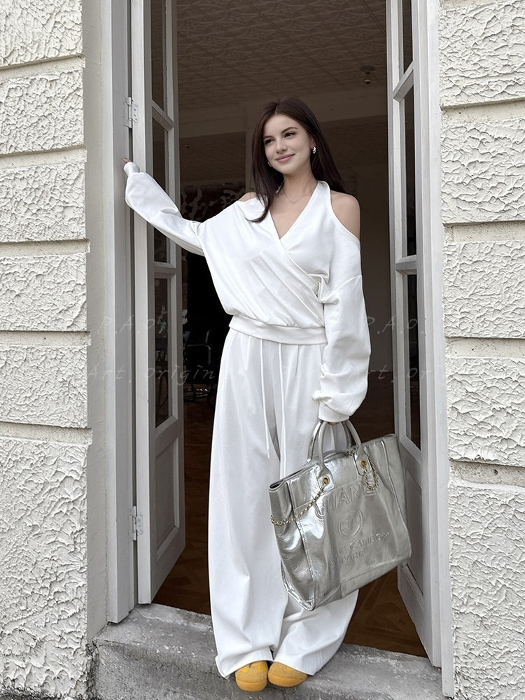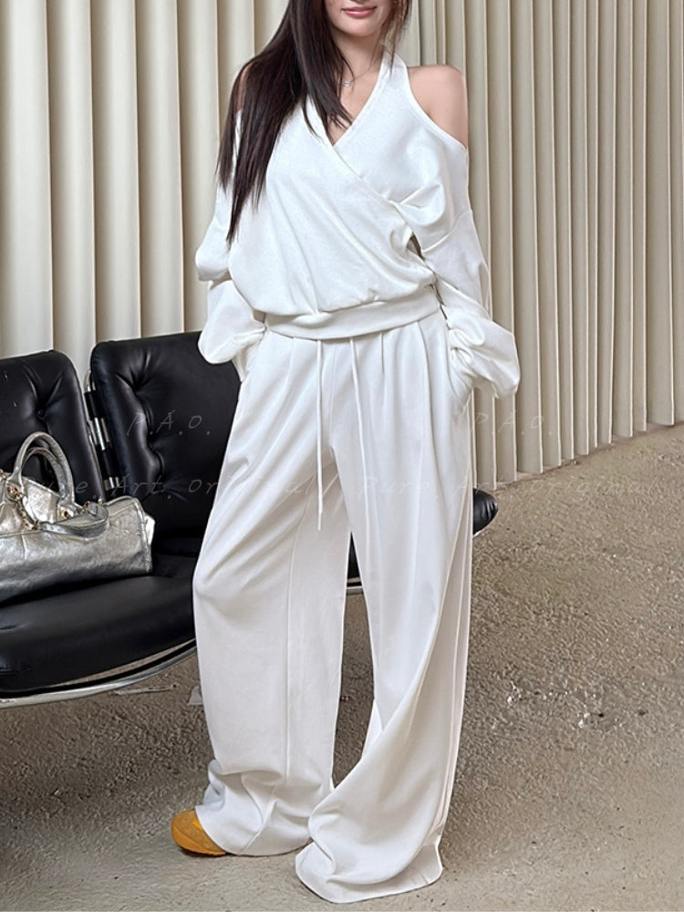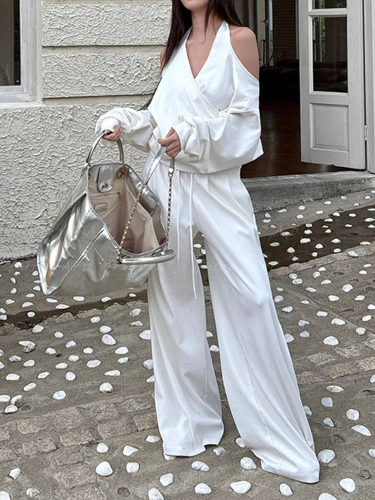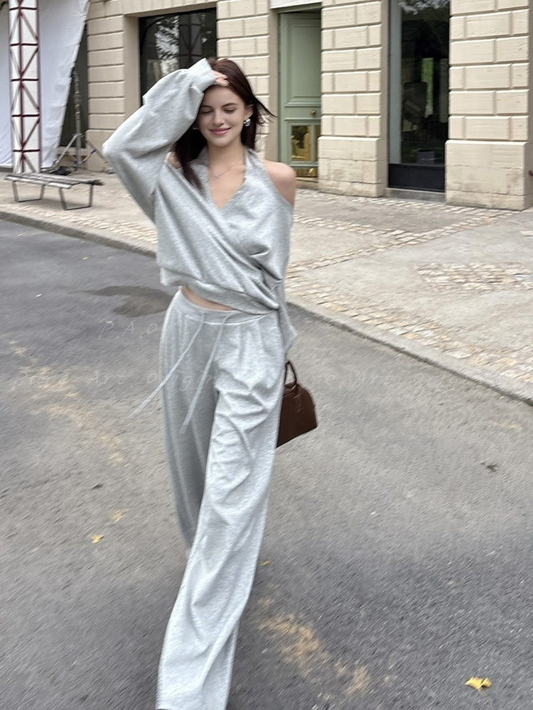 Off‑Shoulder Halter Sweatshirt & Wide‑Leg Pants Two‑Piece Set