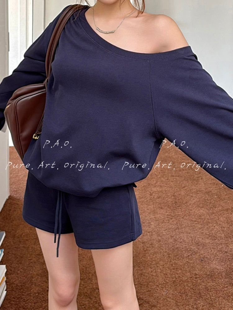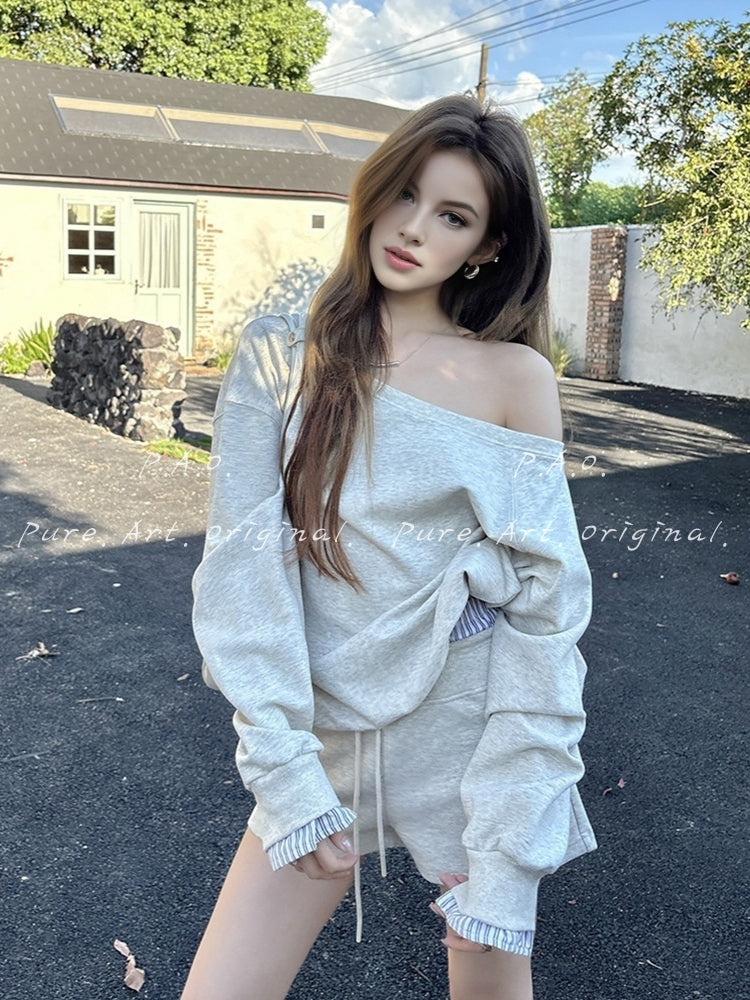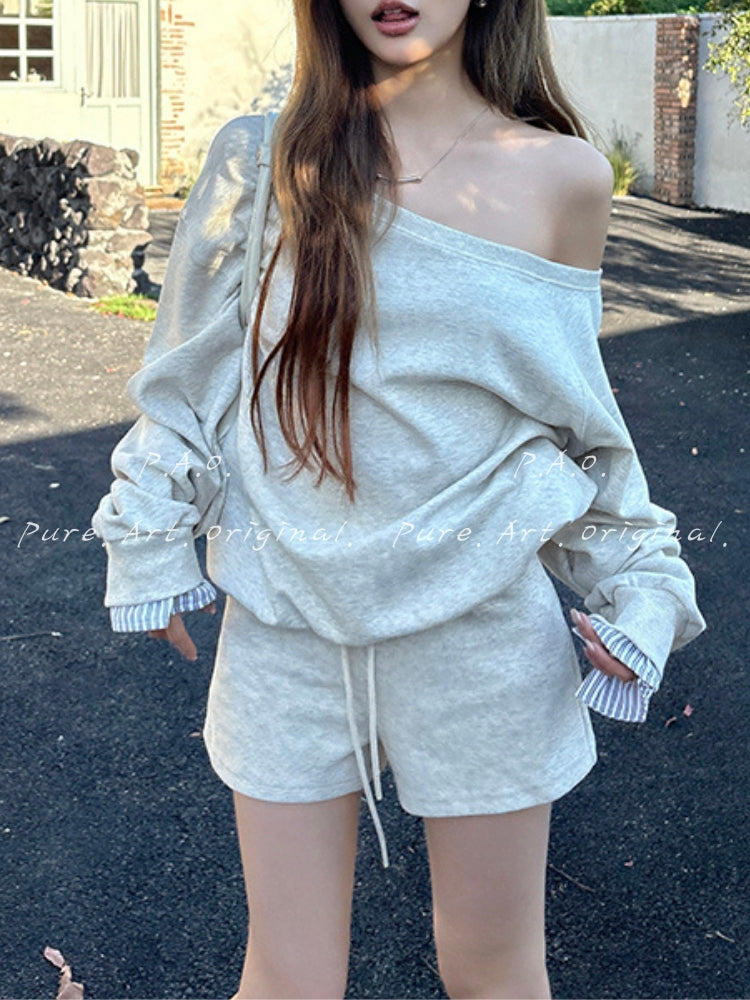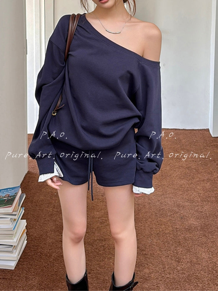Off‑Shoulder Halter Sweatshirt & Color‑Block Shorts Two‑Piece Set