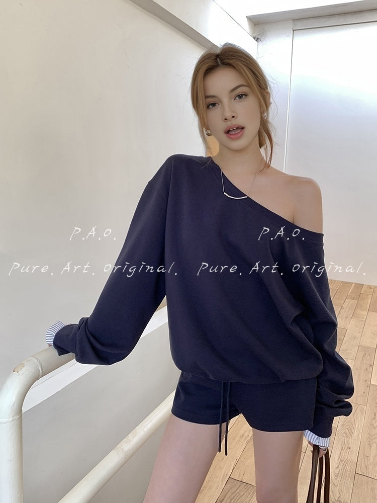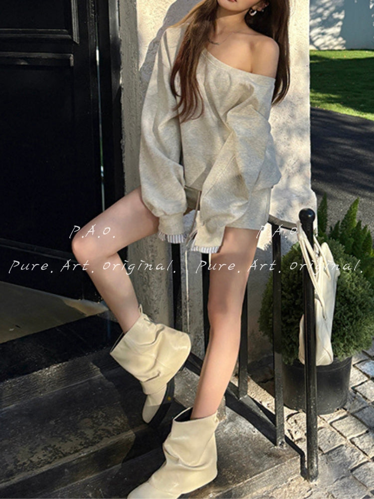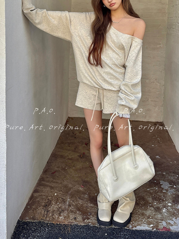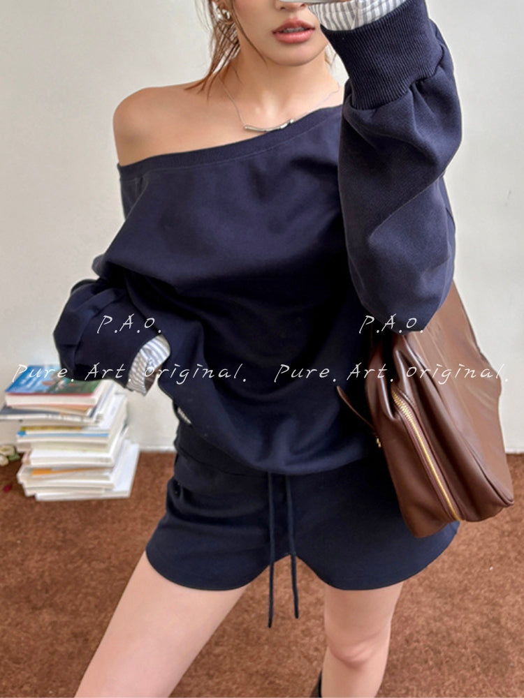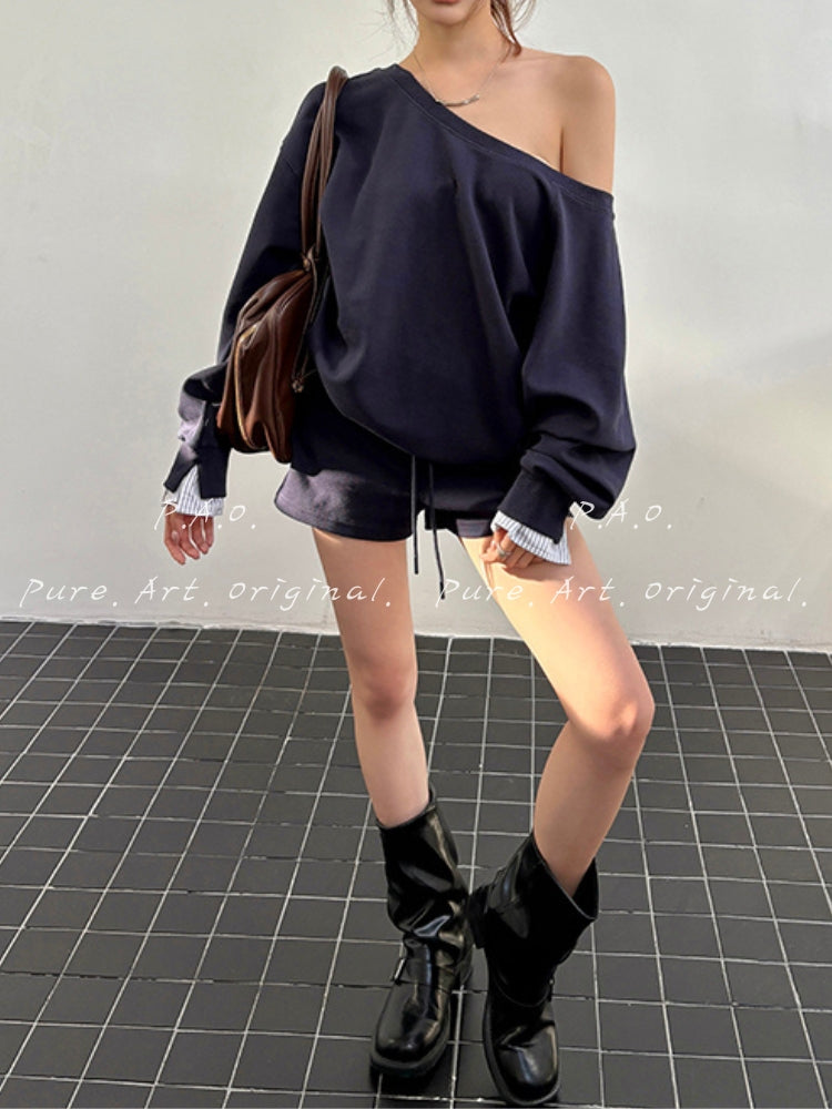 Off‑Shoulder Halter Sweatshirt & Color‑Block Shorts Two‑Piece Set