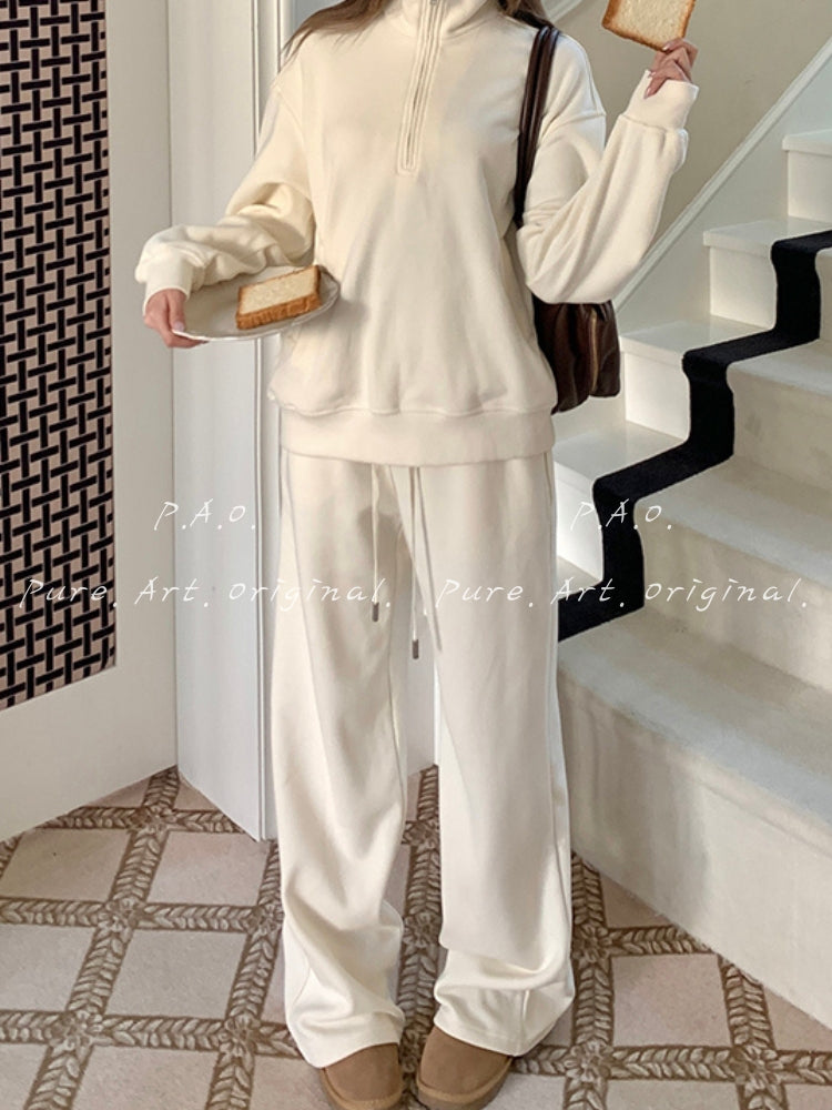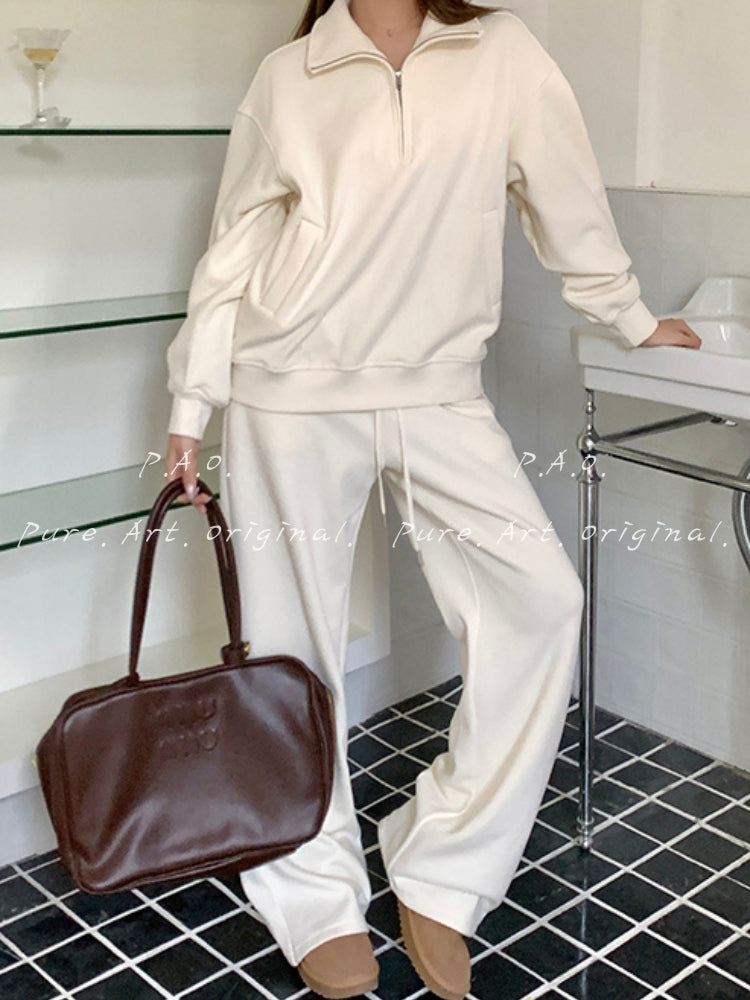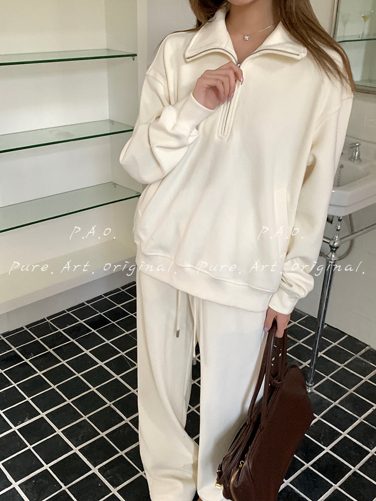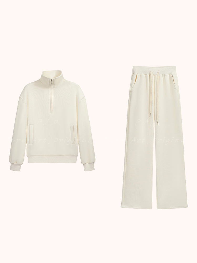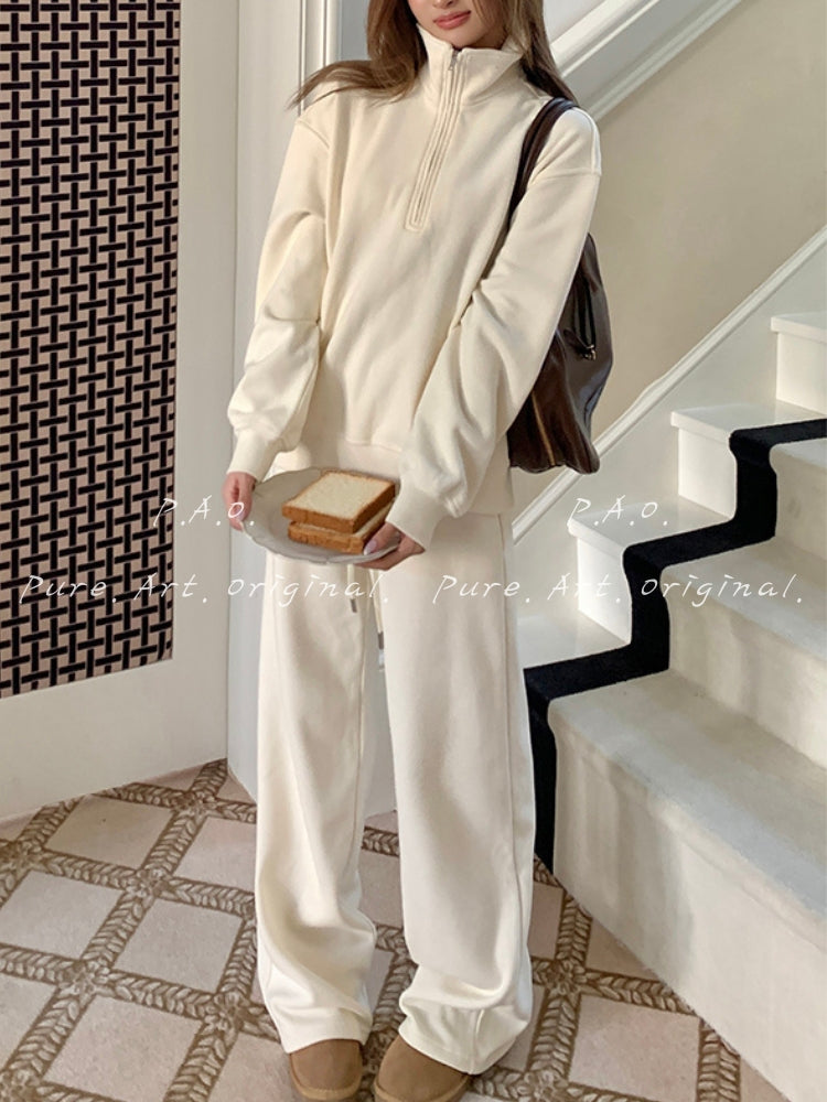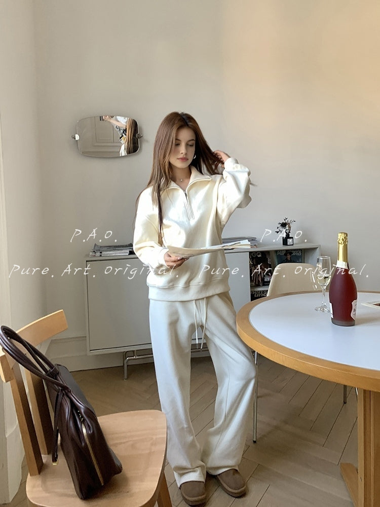 Fleece‑Lined Half‑Zip Polo Sweatshirt & Wide‑Leg Pants Two‑Piece Set