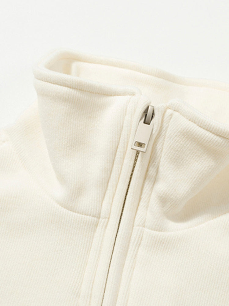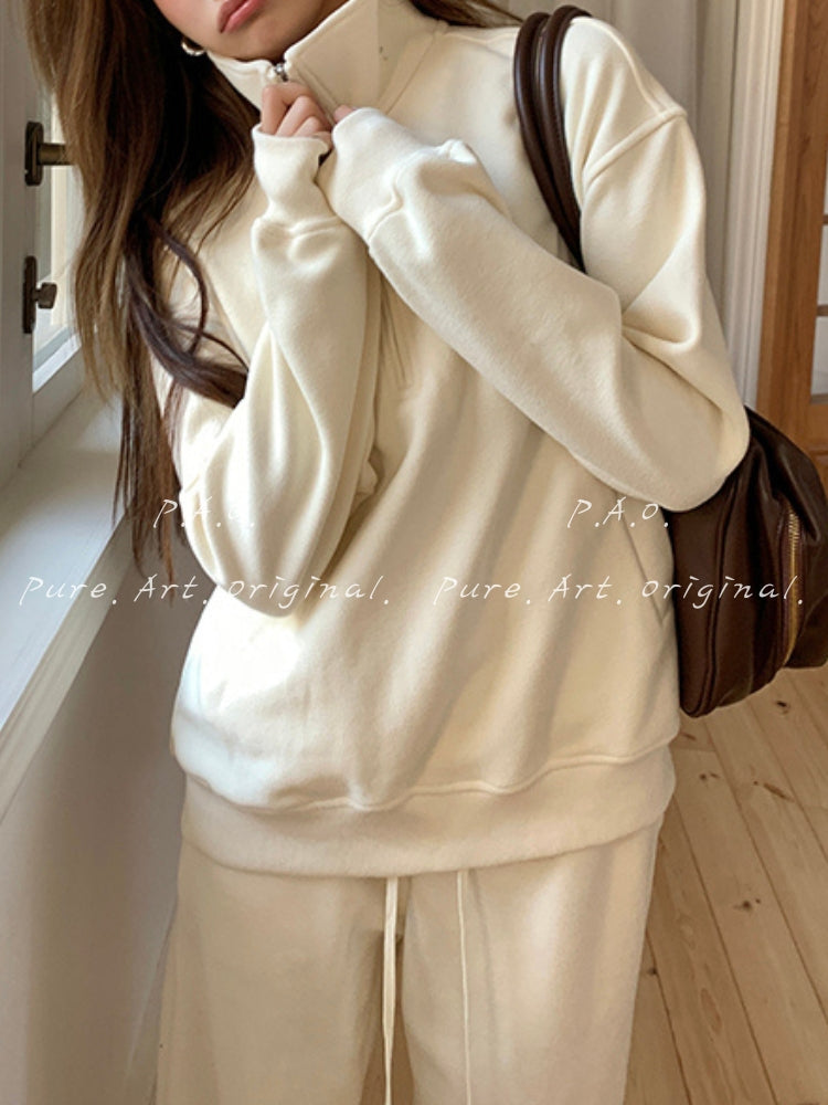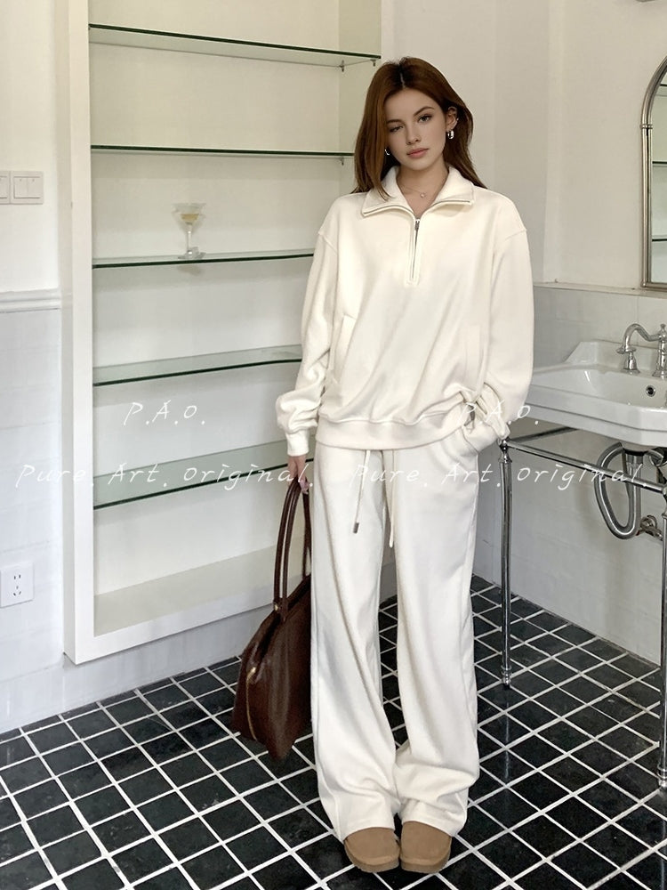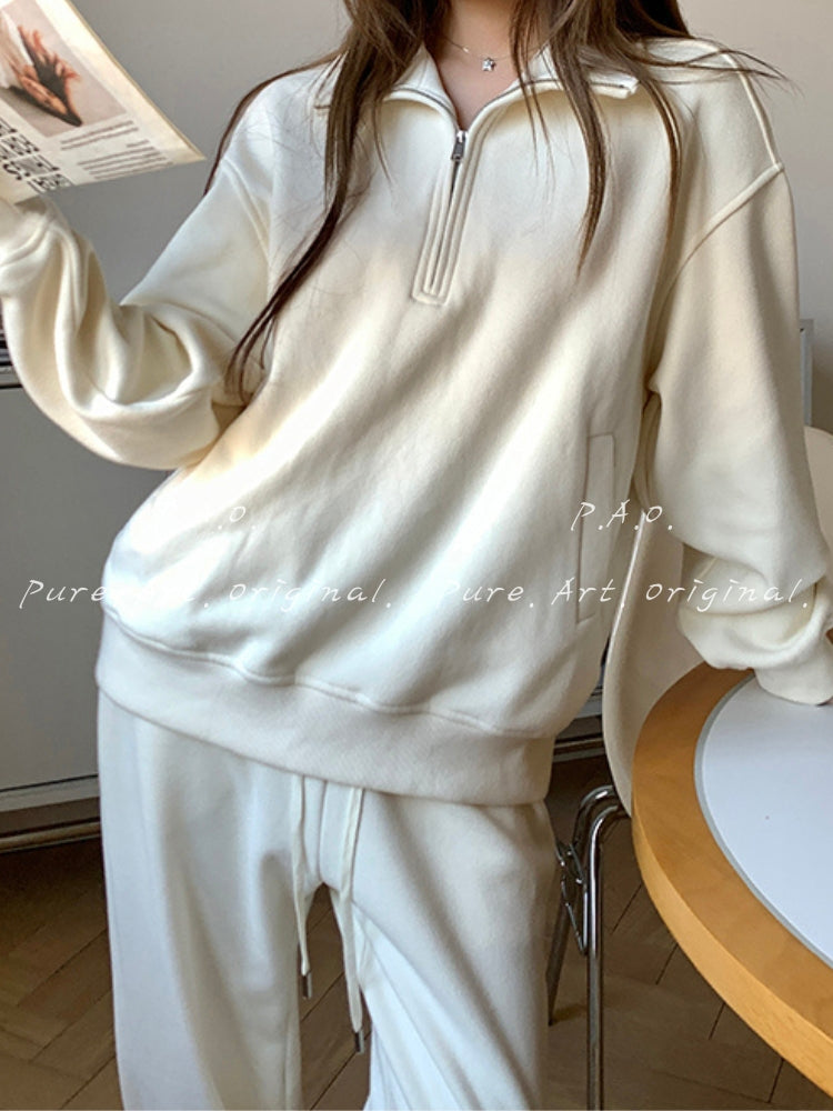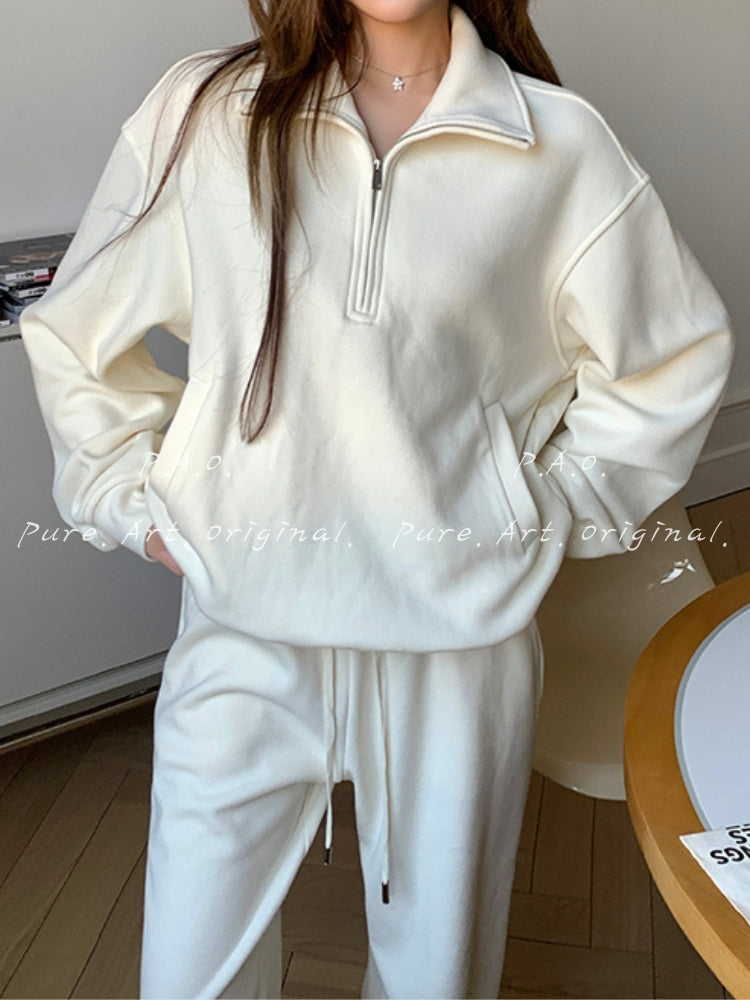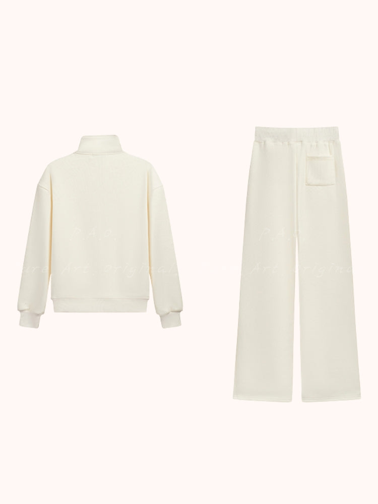 Fleece‑Lined Half‑Zip Polo Sweatshirt & Wide‑Leg Pants Two‑Piece Set