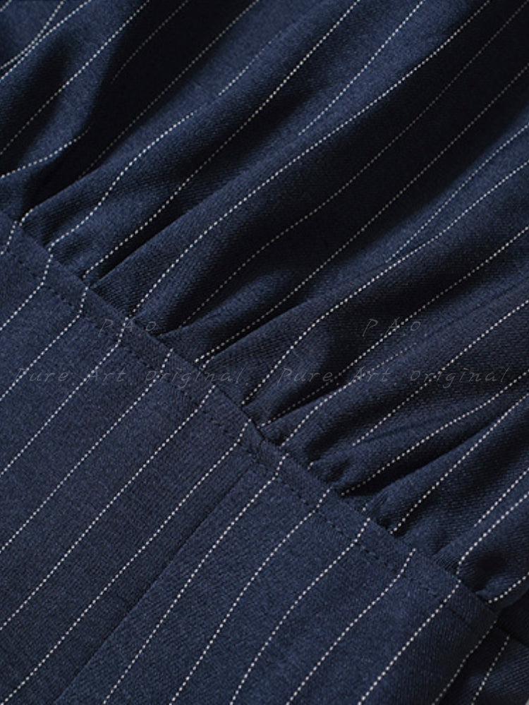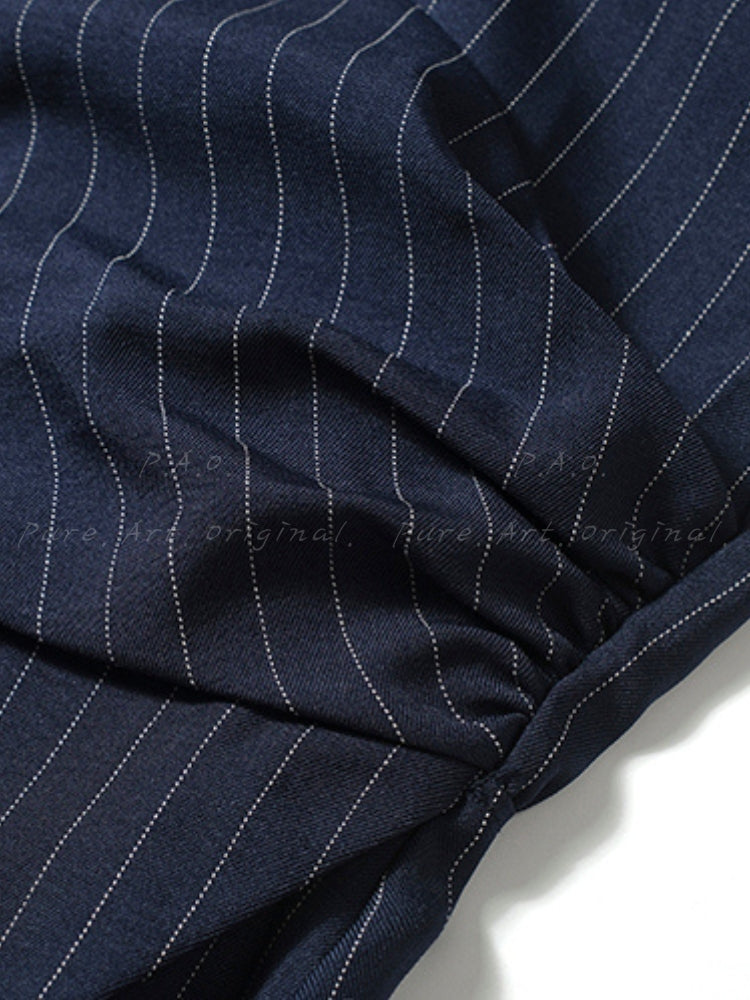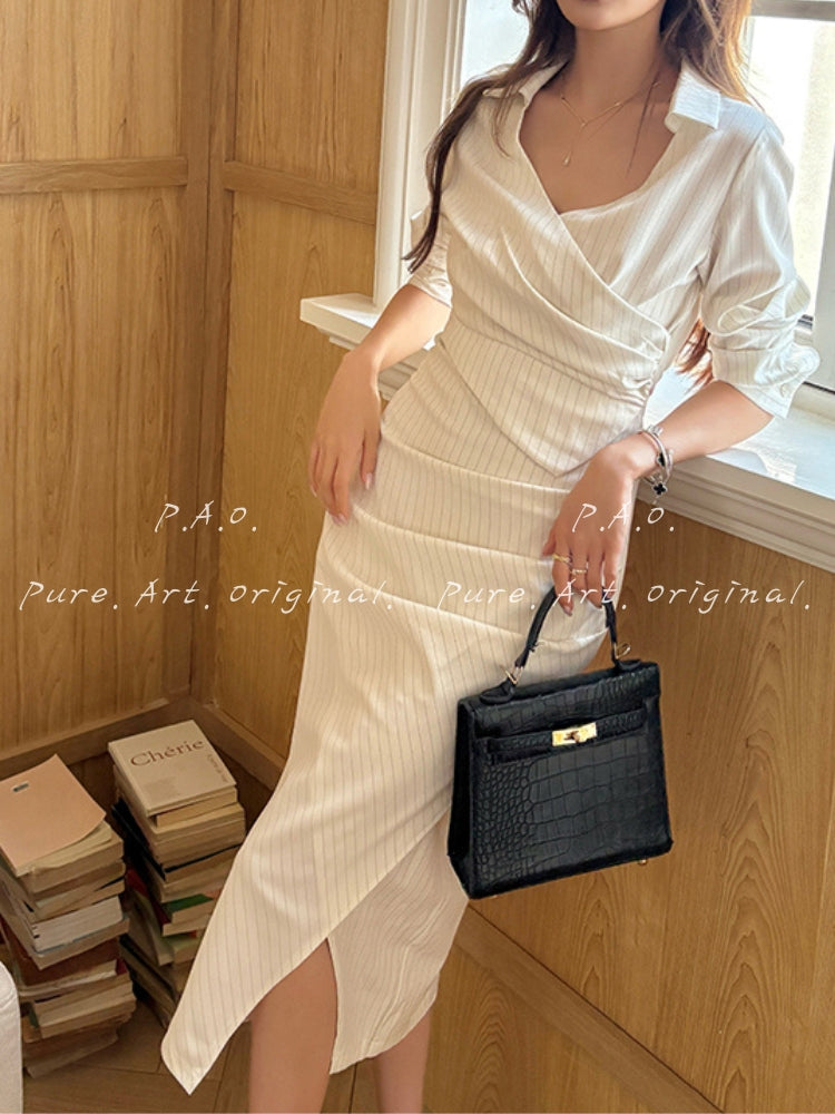 VIVIEN DRESS is a refined striped shirt dress that combines professional polish with effortless elegance. Made from a soft blend of polyester, modal, and spandex knit, this long-sleeve dress features a tailored silhouette that skims the body while adding visual interest through its subtle asymmetrical hem. The classic stripe pattern and structured collar lend a timeless appeal, while the fitted waistline enhances your natural shape. Designed for both work and weekend wear, this dress delivers versatile sophistication — whether styled with heels for a polished office look or with sneakers for a chic, off-duty outfit. Shirt dresses like this are embraced in modern wardrobes for their ability to balance comfort and tailored style.