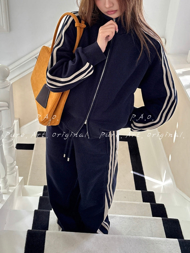 NAVIA FLEECE SET is your go‑to ensemble for effortless, everyday style that doesn’t compromise on comfort. This matching two‑piece set features a fleece‑lined hooded jacket with a zip‑front and clean, modern lines, paired with relaxed wide‑leg pants that drape beautifully for a fluid silhouette. The jacket hits right at the waist, defining your proportions while the vintage stripe detail adds subtle character and classic appeal. Designed in a rich navy hue with contrasting stripes, this set balances comfort and fashion, making it suitable for casual outings, weekend errands, or relaxed social days out. Knit two‑piece sets like this blend laid‑back ease with on‑trend design, offering versatility for both off‑duty looks and styled‑up casual wear.