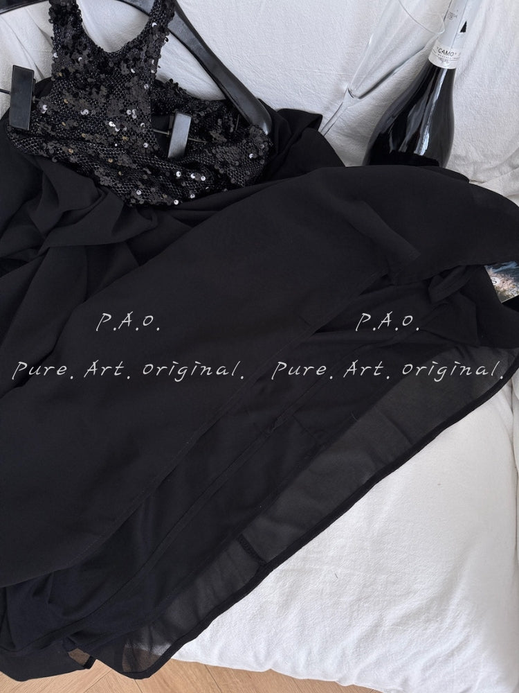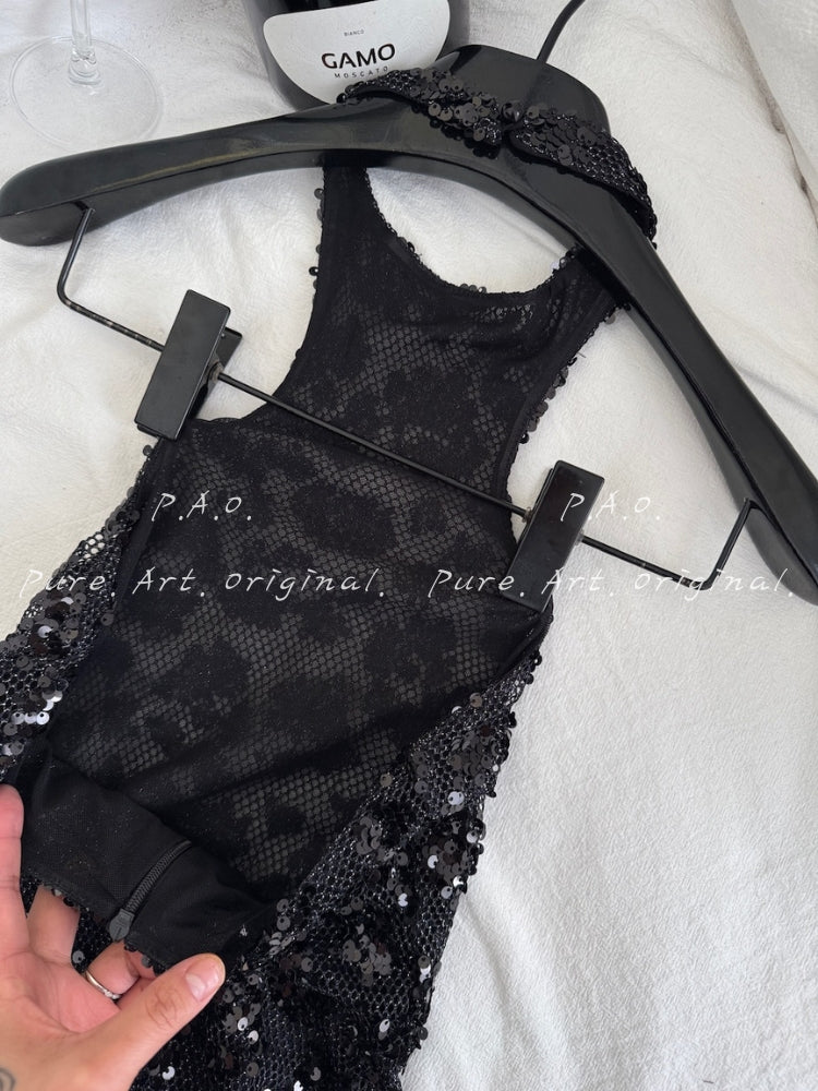 • Contrast of sequin shine and matte black fabric — keeps the look luxe without feeling heavy.