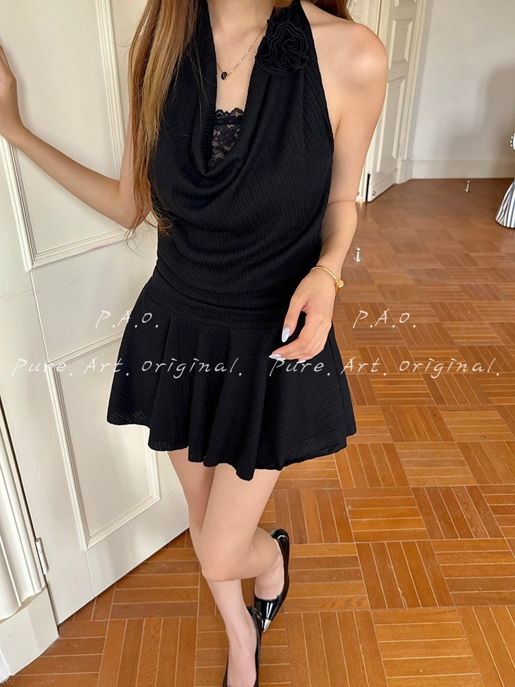 The Noir Rose Mini Dress captures French vintage romance with a modern edge. Designed with a halter neckline that beautifully frames the shoulders and décolletage, this mini dress features a delicate lace-accented bodice with subtle ruching that adds textural charm without overwhelming. The fitted waist transitions into a light, flared skirt that moves with graceful ease — creating a silhouette that’s both flattering and free-spirited.