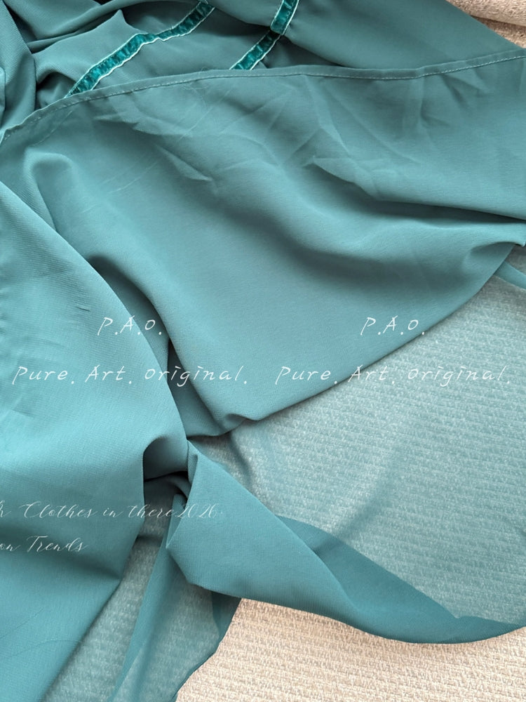 The softly gathered V-neckline enhances the neckline and collarbone, creating a naturally elongated upper silhouette while adding subtle texture and dimension. The ruched bodice provides gentle shaping and support, enhancing the bust without restriction for a balanced and flattering fit.