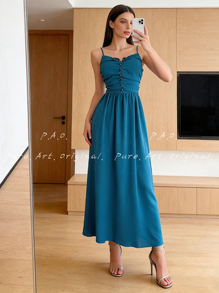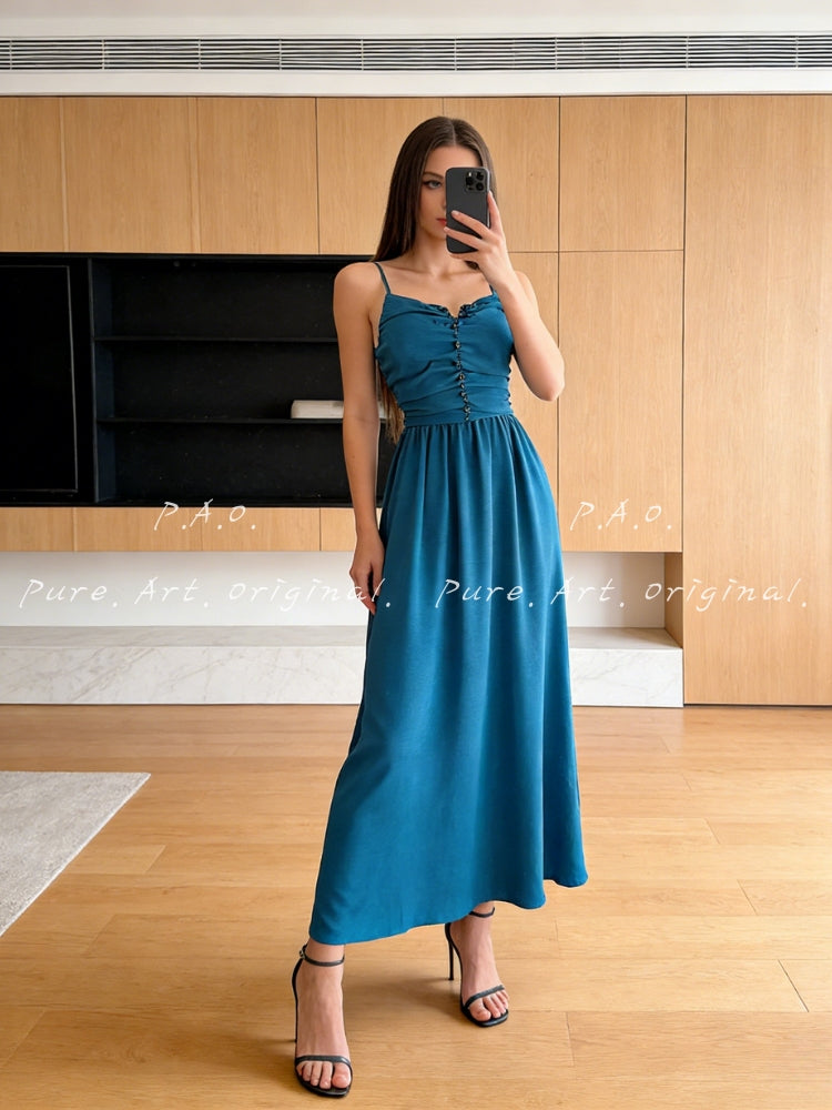 The dress flows into a full A-line maxi skirt that moves gracefully with every step. The extended length and fluid drape create an elevated, elongated silhouette that feels both sophisticated and effortless.