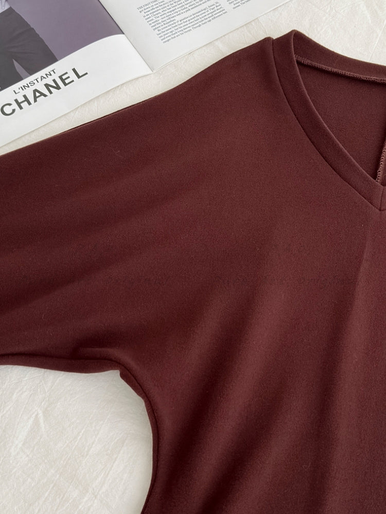 Coordinated two-piece set with a V-neck long-sleeve top and matching micro-flare pants. Classic V-neck design elongates the neckline and adds casual refinement. Wide-leg pants with a natural waist provide ease of movement and relaxed comfort. Knit fabric offers a smooth finish and everyday versatility. Minimalist silhouette makes this set ideal for daily casual wear or athleisure-inspired looks.