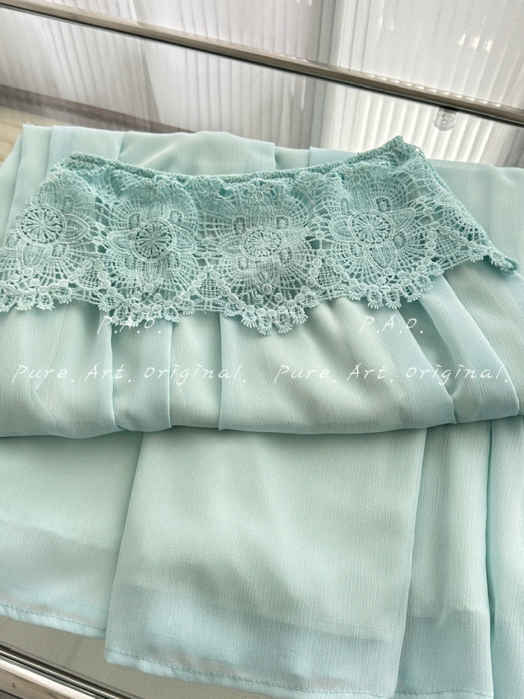 The matching skirt features a high-waisted structure with lace overlay detailing at the waistband, creating a subtle cut-out effect at the waist that enhances shape and proportion. The skirt flows into a full-length A-line silhouette, crafted from lightweight chiffon that drapes softly and moves elegantly with every step. Similar lace and chiffon combinations are widely used in two-piece formal and resort styles for their lightweight feel and graceful movement  .