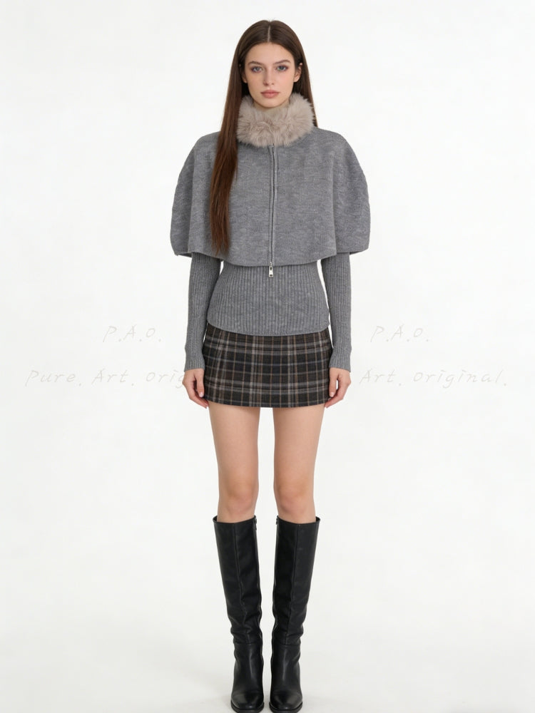 Detachable Faux Fox Fur Collar Cape Sweater Set (Multi-Way Styling) - Grey / S