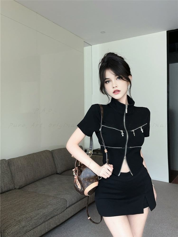 Edgy, modern, and effortlessly cool — this double-zip short sleeve knit top brings a bold twist to everyday styling. Crafted from soft, stretchy polyester knit, it features a unique two-way front zipper that allows for adjustable styling from subtle to statement-making. The fitted silhouette flatters the figure while keeping the look sleek and versatile. Perfect for streetwear looks, casual outings, dates, or layered urban styling.
