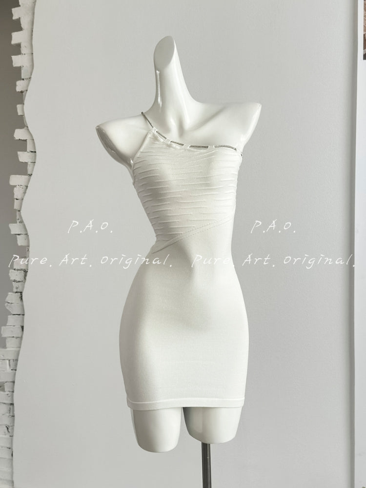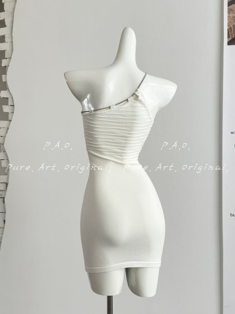 This one-shoulder knit mini dress blends minimalism with statement detail