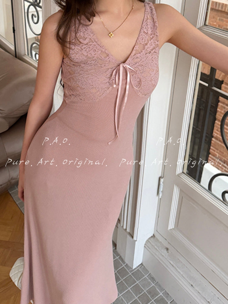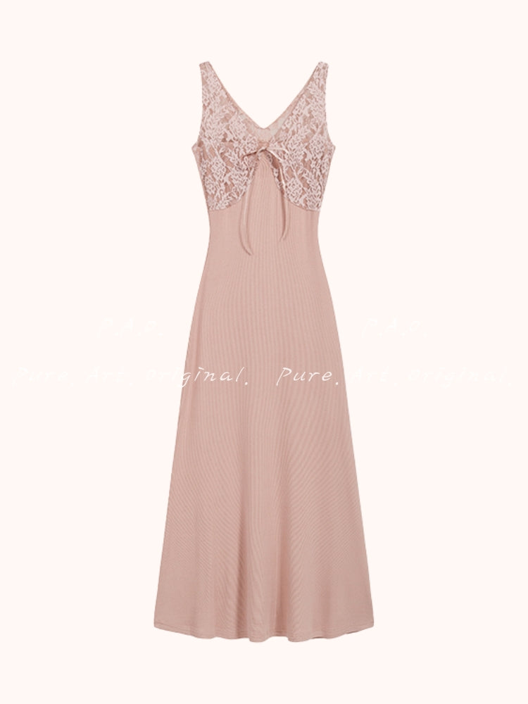 This lace-panel knit maxi dress blends feminine softness with body-hugging structure, creating a naturally sculpted silhouette that feels both elegant and sensual