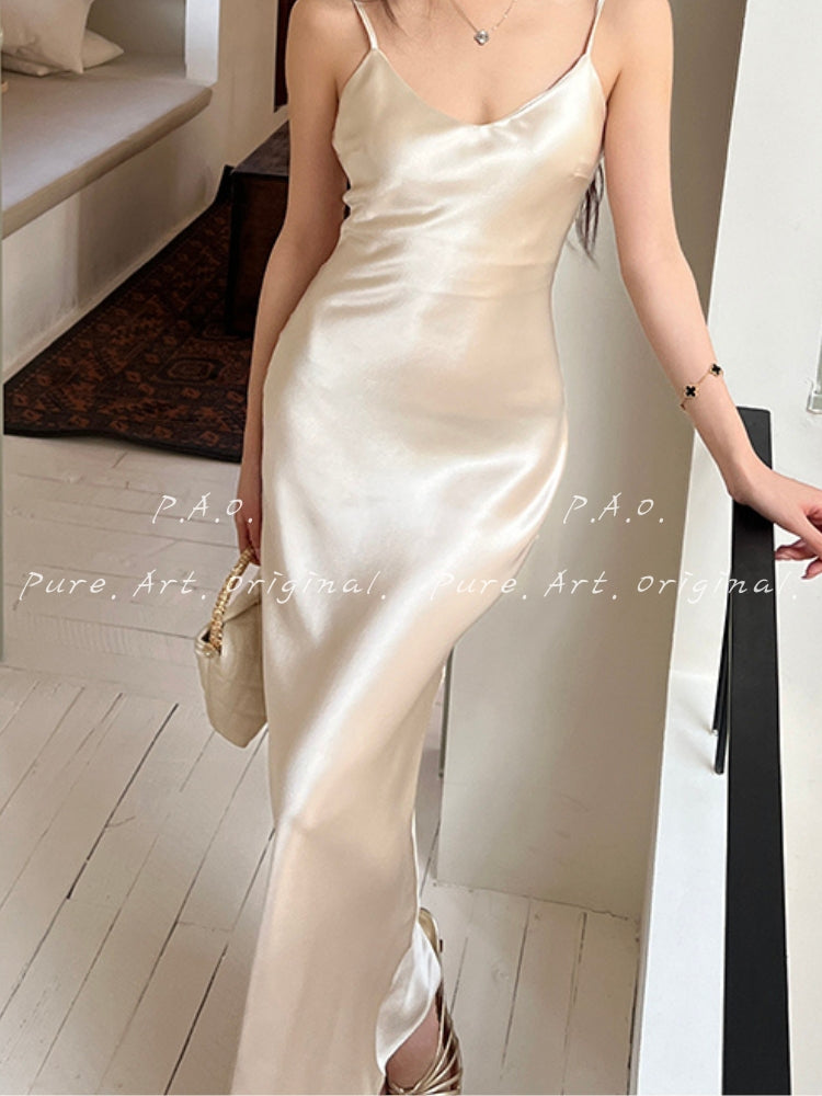 This satin slip maxi dress blends fluid draping with sculpted curves, delivering a refined yet alluring silhouette perfect for evenings, dates, and vacations