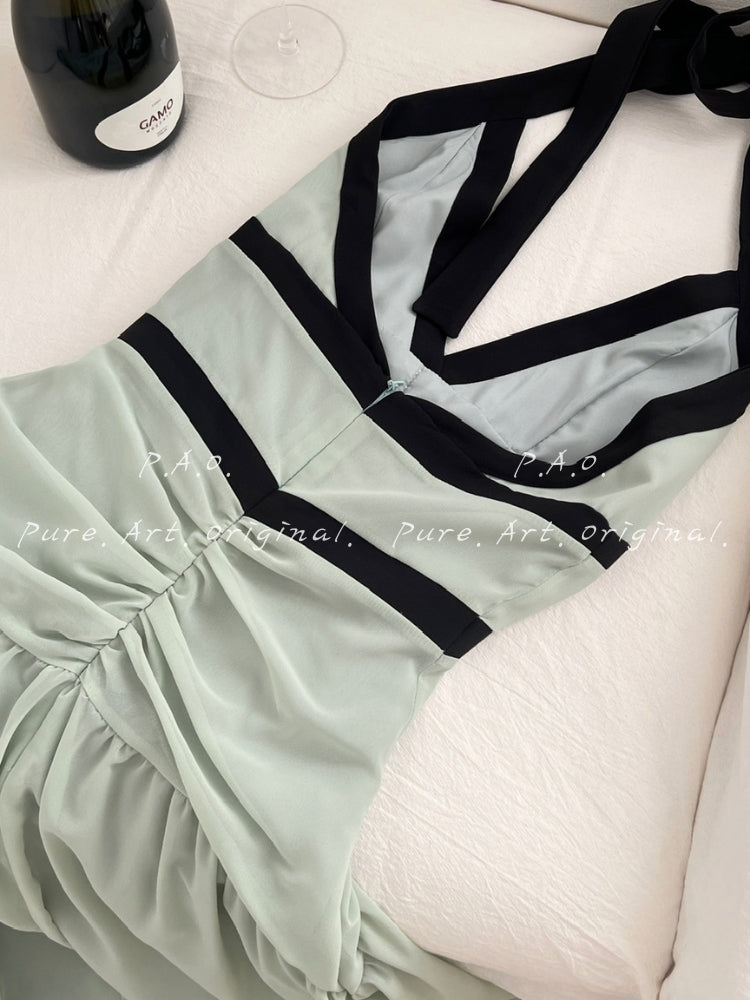 The Elara Dress captures the romantic elegance of a seaside vacation with a flowing silhouette and delicate feminine details. Designed with a halter neckline and open-back design, it beautifully highlights the shoulders, collarbone, and back, creating a refined yet alluring look.